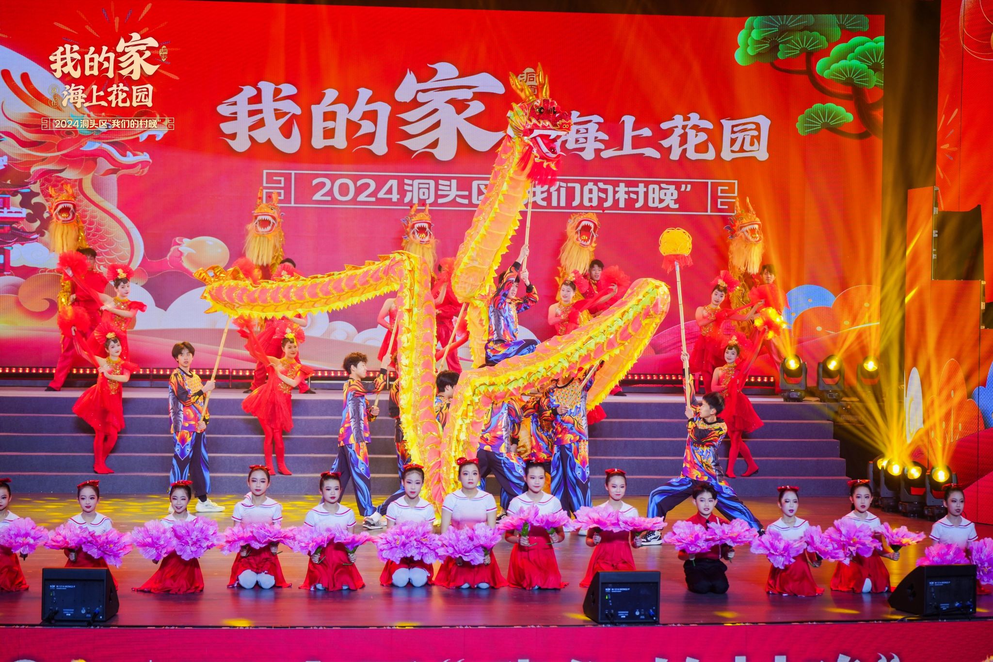 晚会伊始,演出活动在舞蹈《龙腾百岛》活力动感的旋律中拉开了帷幕。歌曲串烧《龙的传人》《风吹麦浪》《欢乐中国年》开启了龙年新篇章,令人血液沸腾;身姿曼妙的渔娘旗袍走秀《繁华》一颦一笑尽显优雅风韵;戏曲串烧《天女散花》《关灯》《梨花颂》等节目轮番上演,引得掌声阵阵;小提琴演奏《梁祝》更是让台下观众沉浸在优美的旋律中;闽南语歌曲串烧《欢喜就好》《世界第一等》《爱拼才会赢》把整台晚会推向高潮;《擂鼓声声迎归帆》《红圆红》将海岛的渔民风情和人文底蕴呈现在观众面前;《我们的村歌》《望海楼》《一汪湛蓝》等原创歌曲一同领略海上花园旖旎风光……晚会在歌伴舞《魅力洞头》中圆满落下帷幕,整场晚会结合龙元素和海岛特色,接地气年味十足。