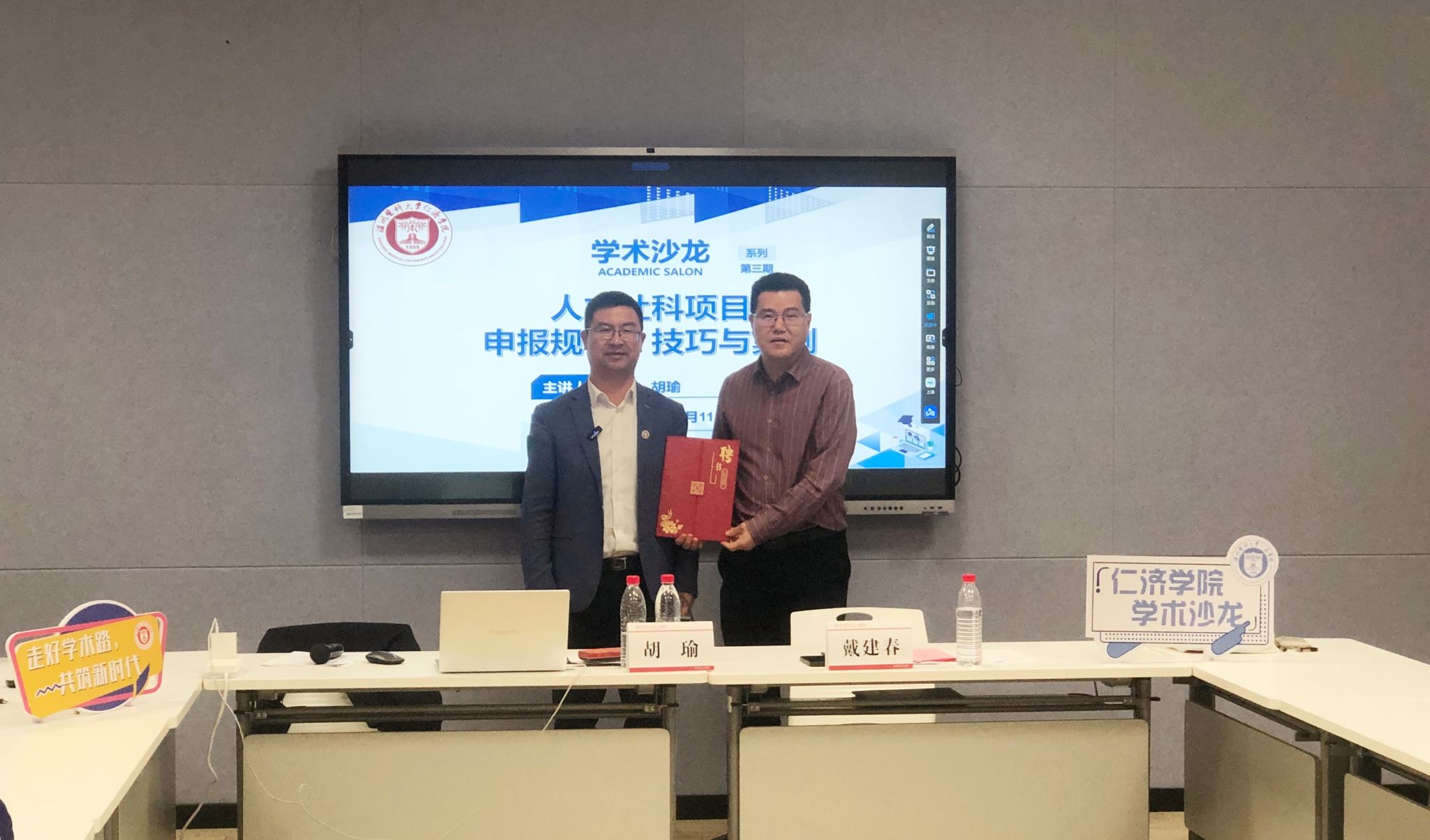 会后,副院长戴建春为胡瑜教授颁发学院教科研项目评审专家聘书,邀请他助力学院科研建设与发展。