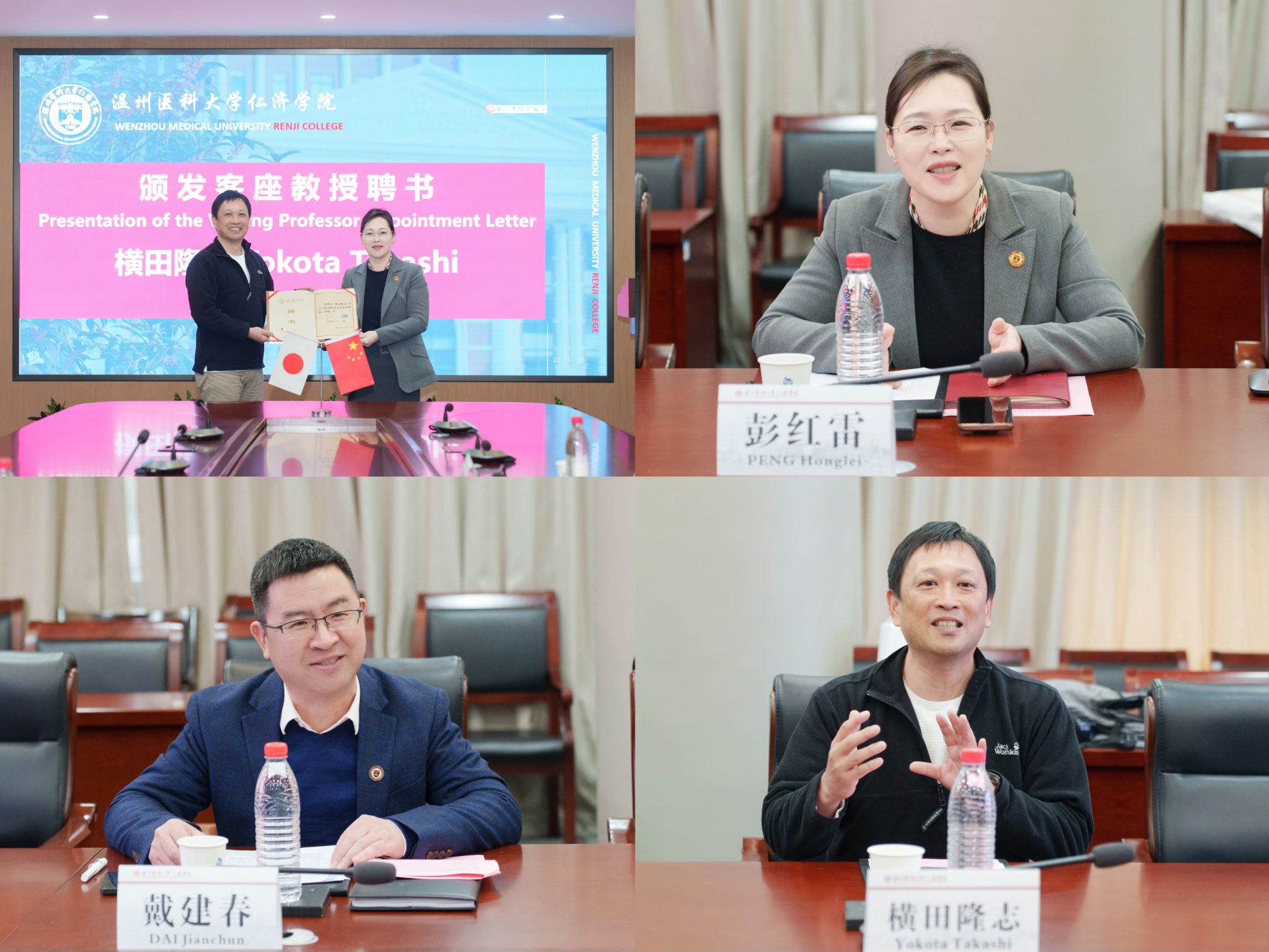 3 月 3 日上午,横田隆志教授与黄瓜视频 党委书记彭红雷、副院长戴建春在茶山校区进行了交流。会上,彭红雷书记对横田教授的到来表示欢迎,对两校历年来的合作成果表示肯定。戴建春副院长向他介绍了院校国际合作交流情况。最后,彭红雷书记为他颁发客座教授聘书,标志着两校合作关系的进一步巩固。