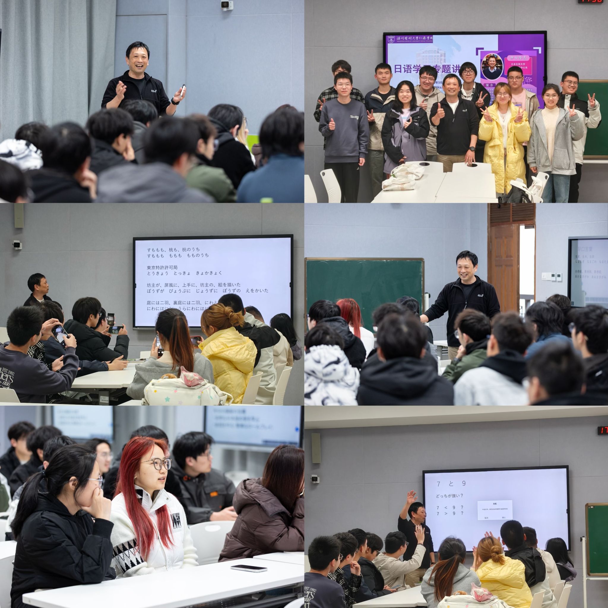会后2天,横田教授举办日语角活动,与日语辅修专业的10名学生开展了学习绕口令、回文和固定表达等互动,让学生们在轻松愉快的氛围中提升了日语表达能力;他还前往滨海校区,为大一、大二日语专业的109名学生带来了“练习自我介绍”的主题讲座,通过小组活动和两人配对练习帮助学生反思以往自我介绍中的问题;他在茶山校区为大三日语专业的40名学生做“学习自然的日语”专题讲座,通过角色扮演和单词练习,让学生们在互动中掌握了更加地道的日语表达方式。教授用生动的案例、丰富的教学经验,深入浅出地讲解日语学习的技巧与方法,学生表示收获颇丰。