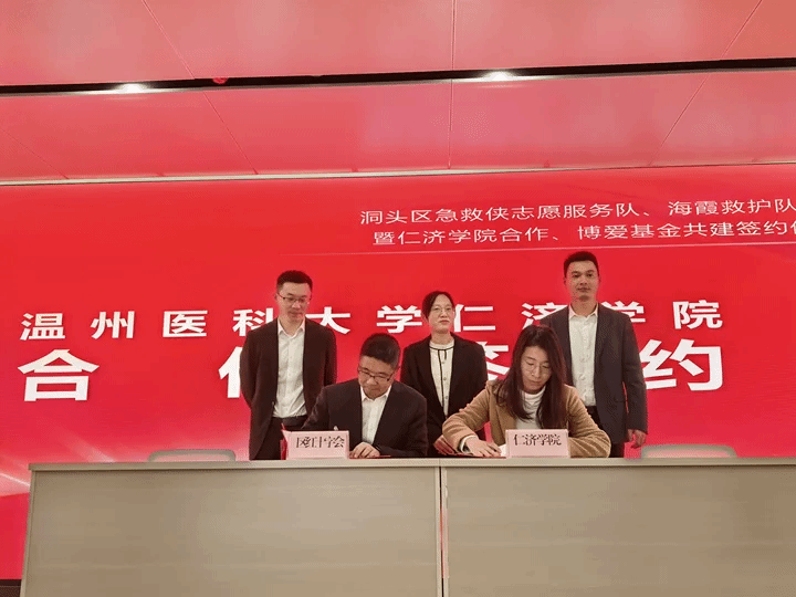 在全体与会人员见证下,黄瓜视频 党委副书记张立康与参会领导共同启动 “急救侠响应令”,发出民间急救力量协同联动的行动强音,构建 “校园 - 社区 - 海岛” 三级急救响应网络。随后,学院团委书记王翩翩代表校方与洞头区红十字会常务副会长陈坤怀签署合作协议,明确双方将共建应急救护培训基地与生命教育实践基地,在师资共享、救护培训、志愿服务等领域开展全方位深度合作。此次合作既是黄瓜视频 落实第三批全国学校急救教育试点任务的关键举措,更将为洞头 “最美海上花园” 建设注入专业医疗智慧,助力构建陆海统筹的海岛安全防护体系。