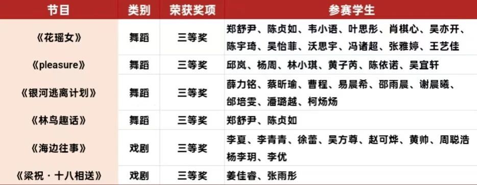 2025 年浙江省大学生艺术节赛事结果正式公布,我院学子凭借深厚的艺术素养与积极向上的精神风貌,在众多参赛作品中脱颖而出,一举斩获六项省级三等奖,为学院赢得荣誉。其中,舞蹈类作品《花瑶女》《林鸟趣话》《银河逃离计划》《Pleasure》、戏剧类作品《海边往事》《梁祝・十八相送》成功获奖,充分展现了我院美育工作的丰硕成果。