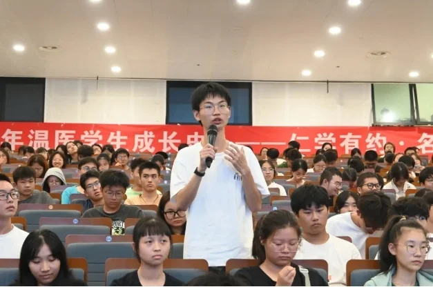赵伟教授深情回顾了自己在温医求学的难忘时光,分享了他在温医的学习经历和对医学事业的热爱。早年在温医的“停电点蜡烛看书,寒冬废寝忘食考研”经历,让在座学子不禁为他的精神鼓掌。他特别感谢温医的老师们对他的帮助和指导,并强调了温医的求学经历为他日后在医学领域取得的成就奠定了坚实的基础。