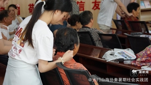 “大家别急,温州的专家们会为每个人都看诊,没轮到的阿公阿婆、叔叔阿姨们请先坐着休息,我们给大家推拿按摩。”实践团成员一边维持现场秩序,一边为等待的村民们提供推拿按摩等服务。与此同时,实践队员还与村民们一起积极参与了CPR人工心肺复苏与AED急救培训和演练。