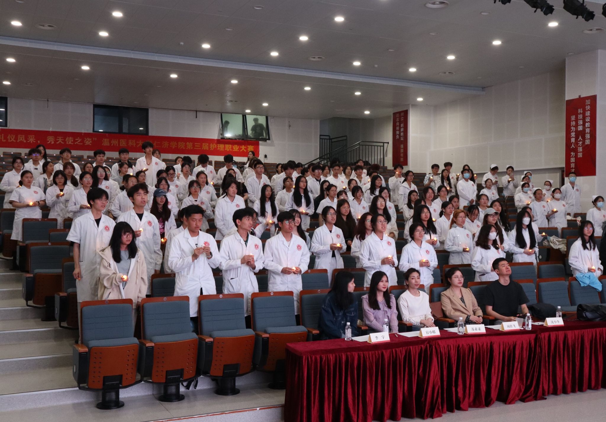 “我宣誓,以真心、爱心、责任心对待每一位病人,永葆白衣天使的圣洁。”在蜡烛宣誓环节,学生们手持蜡烛,庄严宣誓,表达对护理事业的忠诚和热爱,更加坚定为患者服务的决心。在活动结尾,同学们为本次比赛特邀嘉宾苏素素惊喜献花,送上节日祝福,一堂生动的职业节日课堂,在致敬最美白衣天使中落下帷幕。
