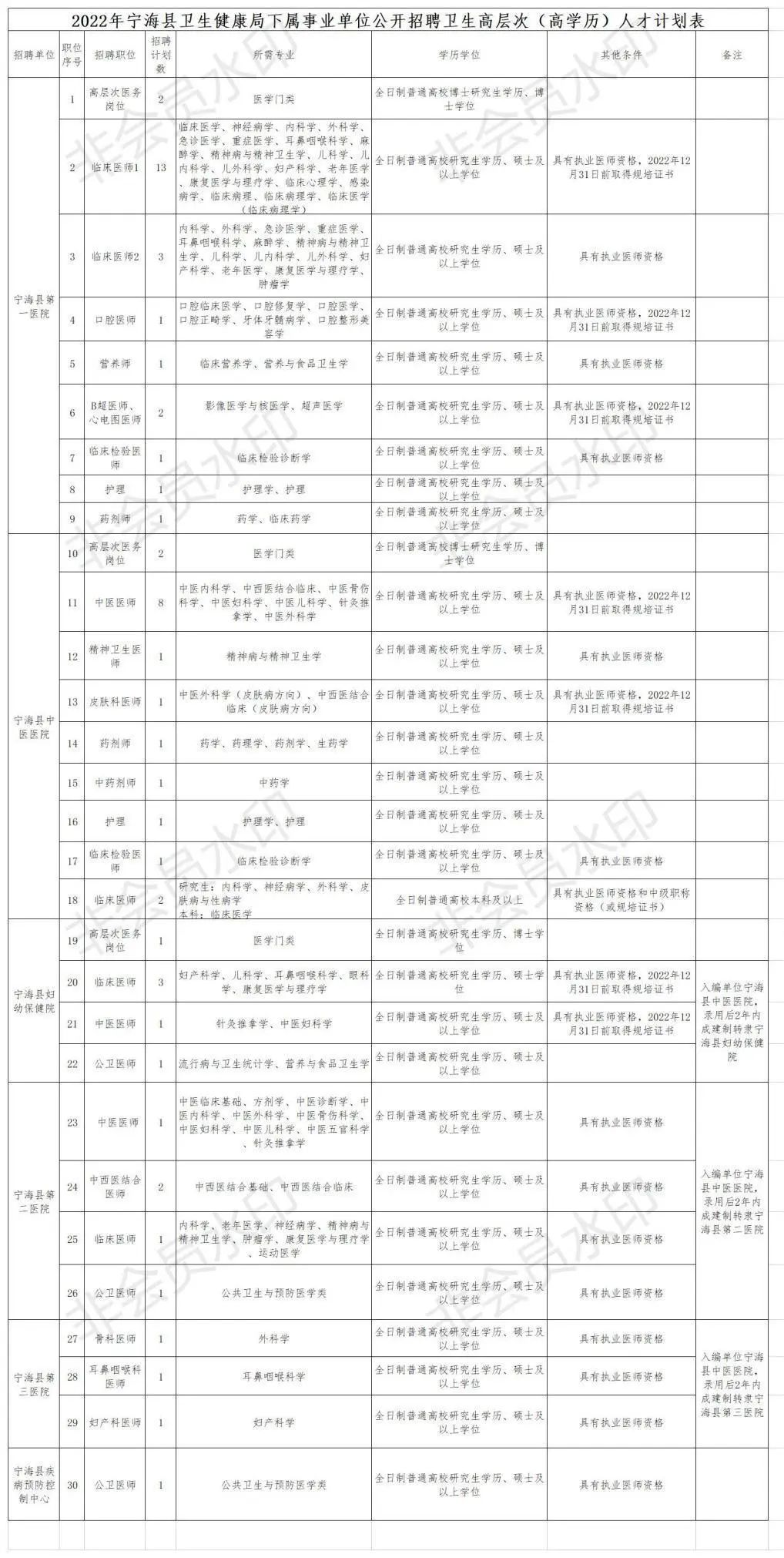 4.学历学位要求具体见《2022年宁海县卫生健康局下属事业单位公开招聘卫生高层次(高学历)人才计划表》;