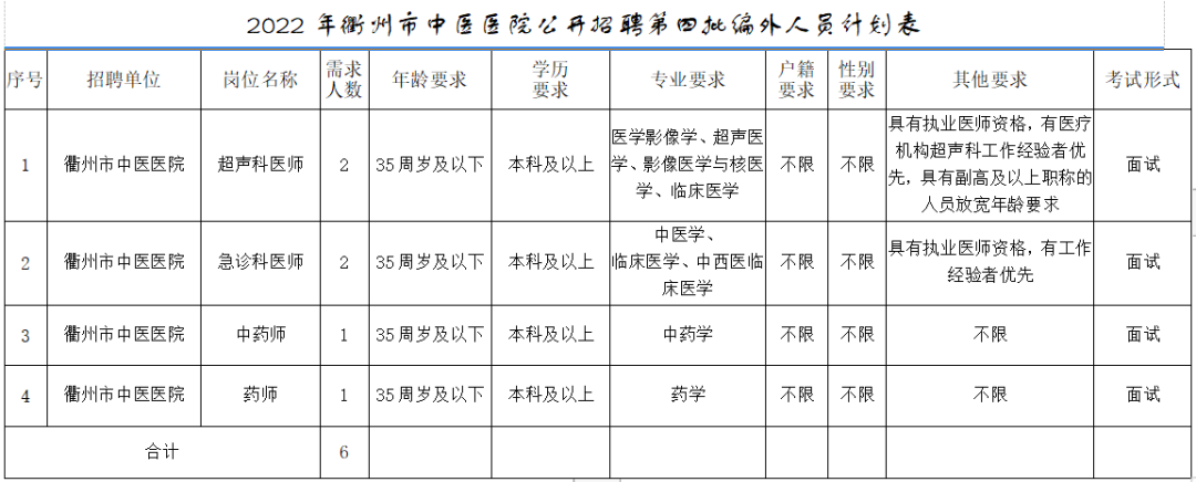 本次计划招聘6名编外人员,具体岗位详见《2022年衢州市中医医院公开招聘第四批编外人员计划表》(附件1)。