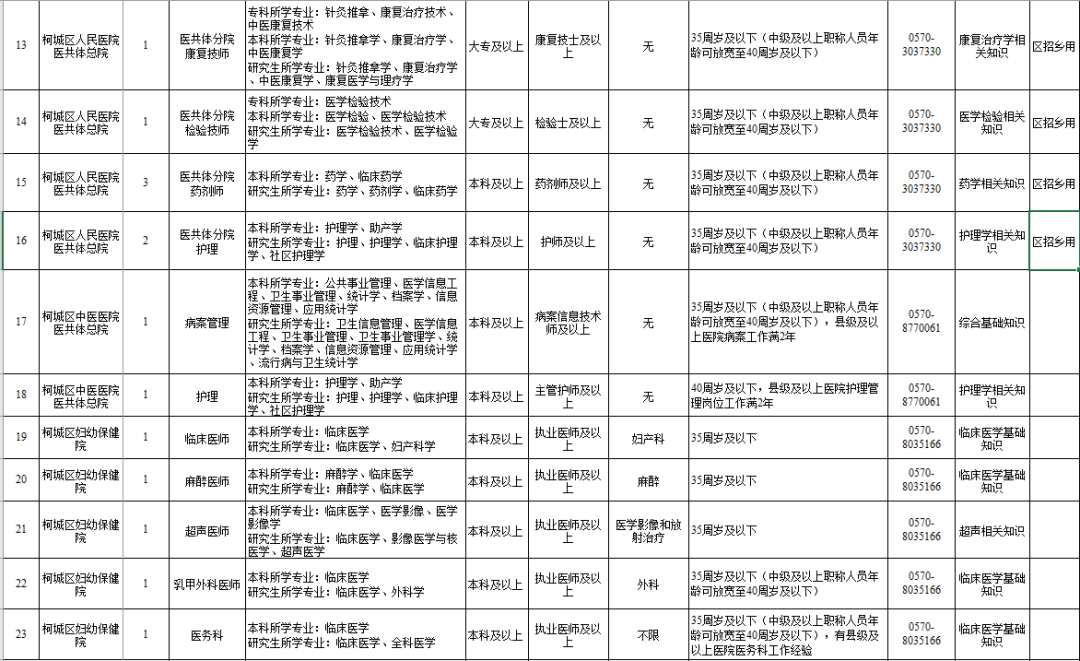 1.本次公开招聘柯城区人民医院医共体总院、柯城区中医医院医共体总院和柯城区妇幼保健院的人员聘用后实行公立医院报备员额管理。其中“区招乡用”人员工作岗位在柯城区医共体分院。