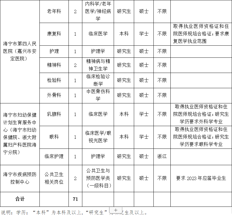 海宁市卫健系统公开招聘事业单位卫技人员71名,招聘岗位详见招聘岗位条件及计划表(附件1)。