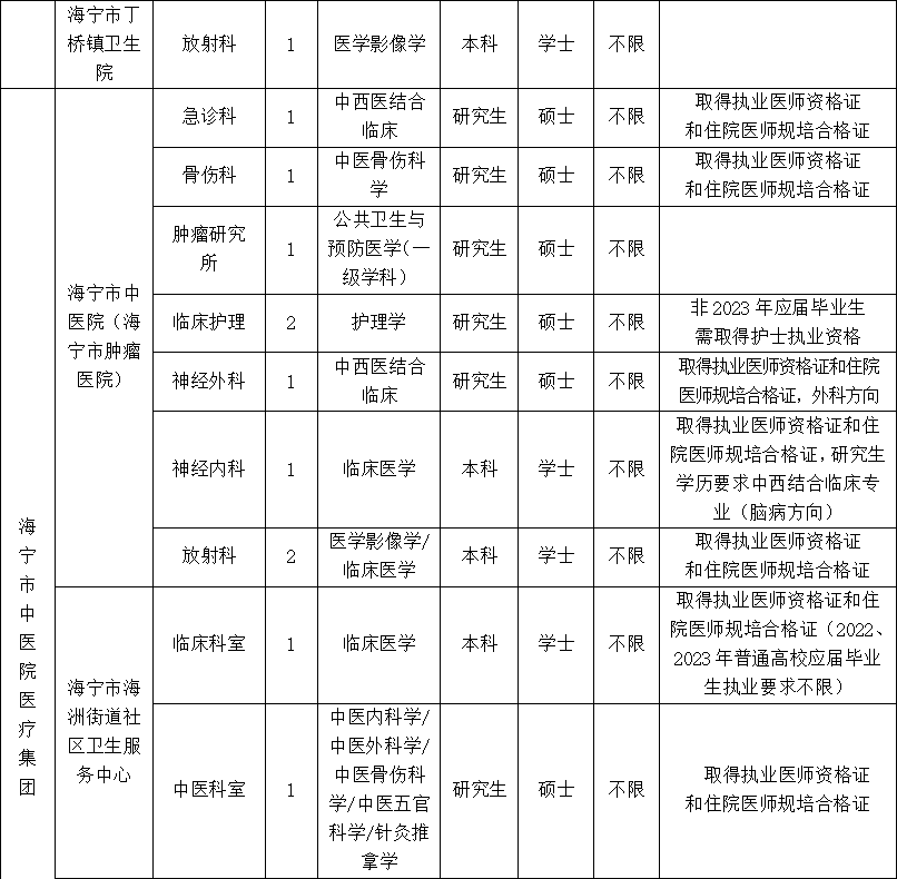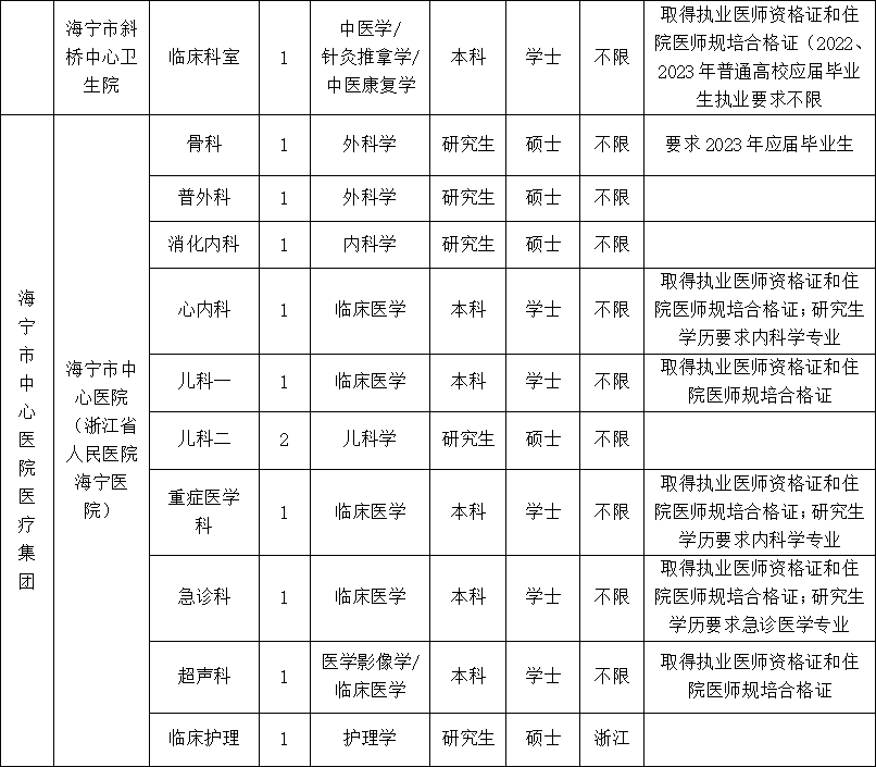 (二)普通高校毕业生或2022、2023届普通高校应届毕业生,符合招聘岗位所需求的专业、学历、学位、专业技术资格、执业资格、户籍等要求;岗位条件有医师执业资格要求的,其注册的执业范围应符合岗位要求,并且取得的截止时间为2022年11月27日。研究生学历报考本科岗位的,其二级学科名称应符合该岗位要求,对于岗位有住院医师规培合格证要求的,2023年应届毕业生应在2023年9月30日前提供住院医师规培合格证;除有备注岗位外硕士及以上研究生要求专业型。没有学位要求的岗位,不受普通高校限制。