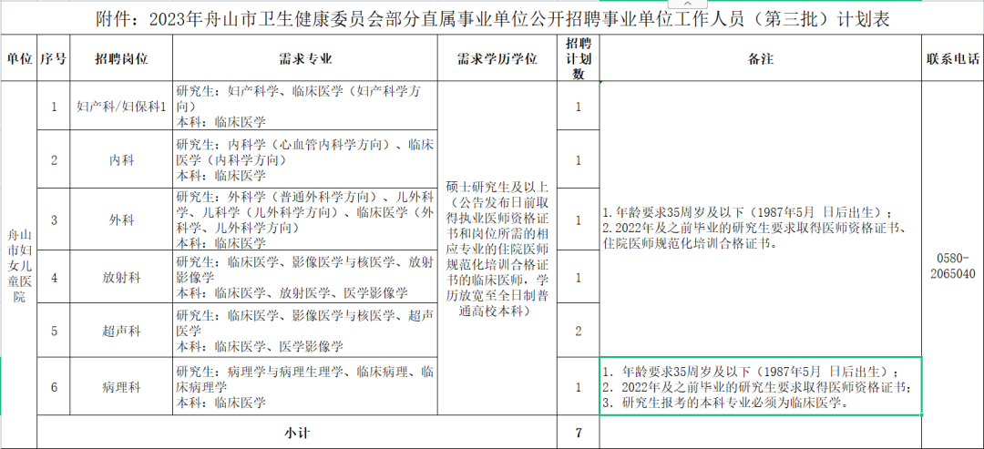 本次舟山市妇女儿童医院招聘工作人员共7名(招聘计划详见附件1)。