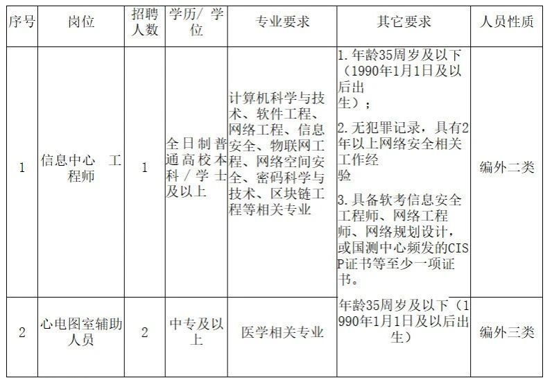 因医院业务发展需要,现招聘编外合同制人员3名,具体招聘岗位、要求和报名方式如下。