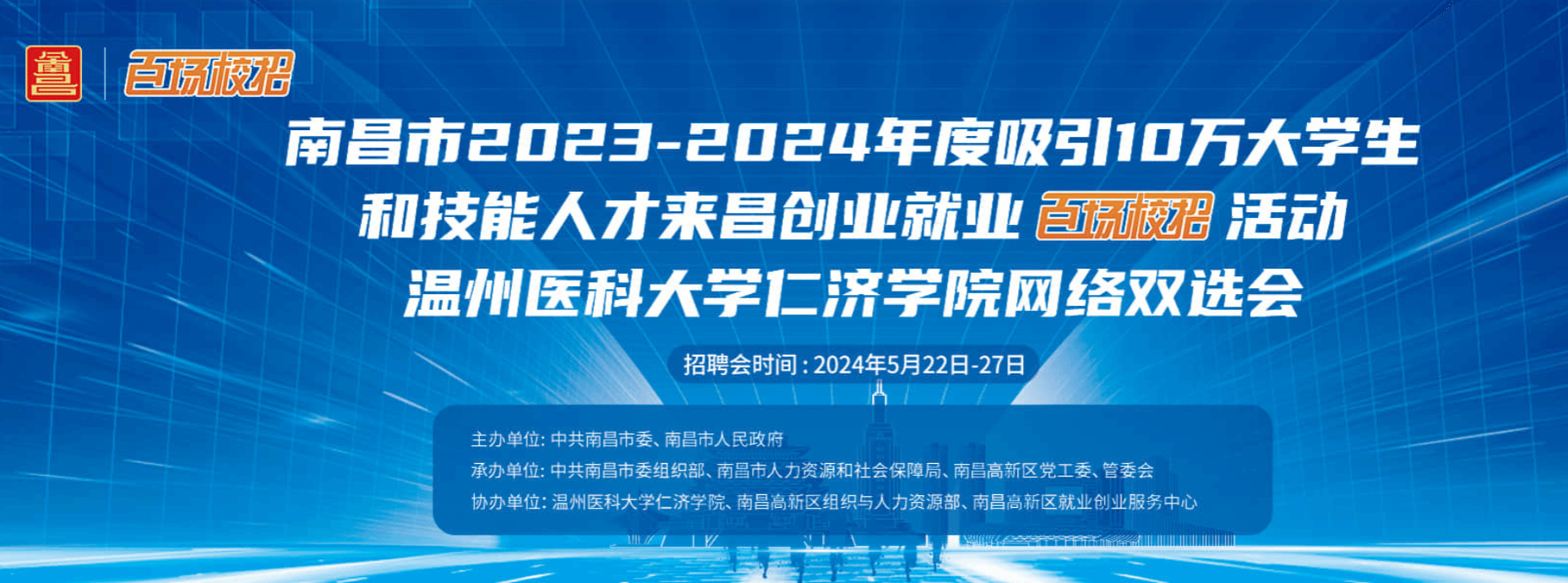 为进一步贯彻落实南昌市第十二次党代会提出的“每年吸引10万名大学生和技能人才来我市创业就业”的工作目标,深入开展2023-2024年度“百场校招”活动,积极营造赣籍学子“来昌回昌”的就业氛围,吸引更多优秀大学生和技能人才来昌创业就业。