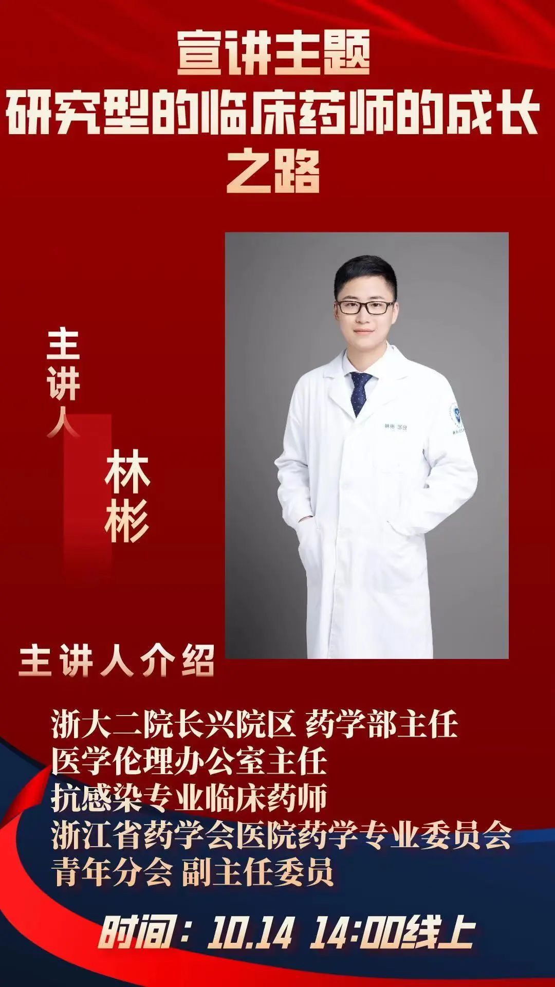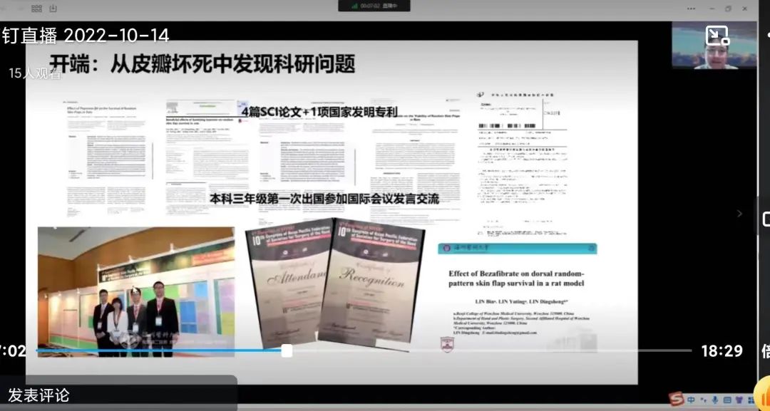 浙江大学医学院附属第二医院长兴院区药学部的林彬学长首先简单介绍了自己的学习成长经历,讲述了自己本科阶段参与的相关项目的研究、出国参与国际会议的部分经历,以及这些宝贵经历对自身的影响,并鼓励学弟学妹们也应勇于尝试。随后,林学长举例介绍了药物研究的药动学差异,并分享了自己在临床研究中发现的问题感悟。最后林彬学长表达了对受到本科母校邀请自己参加这次分享活动的荣幸,并对药学研究感兴趣的学弟学妹们表示欢迎。