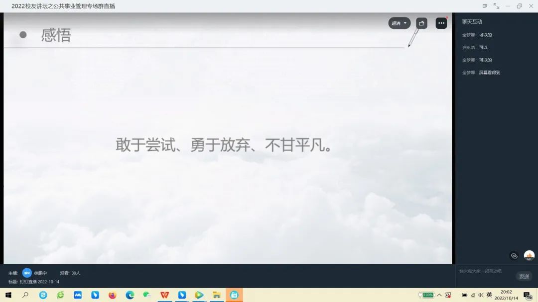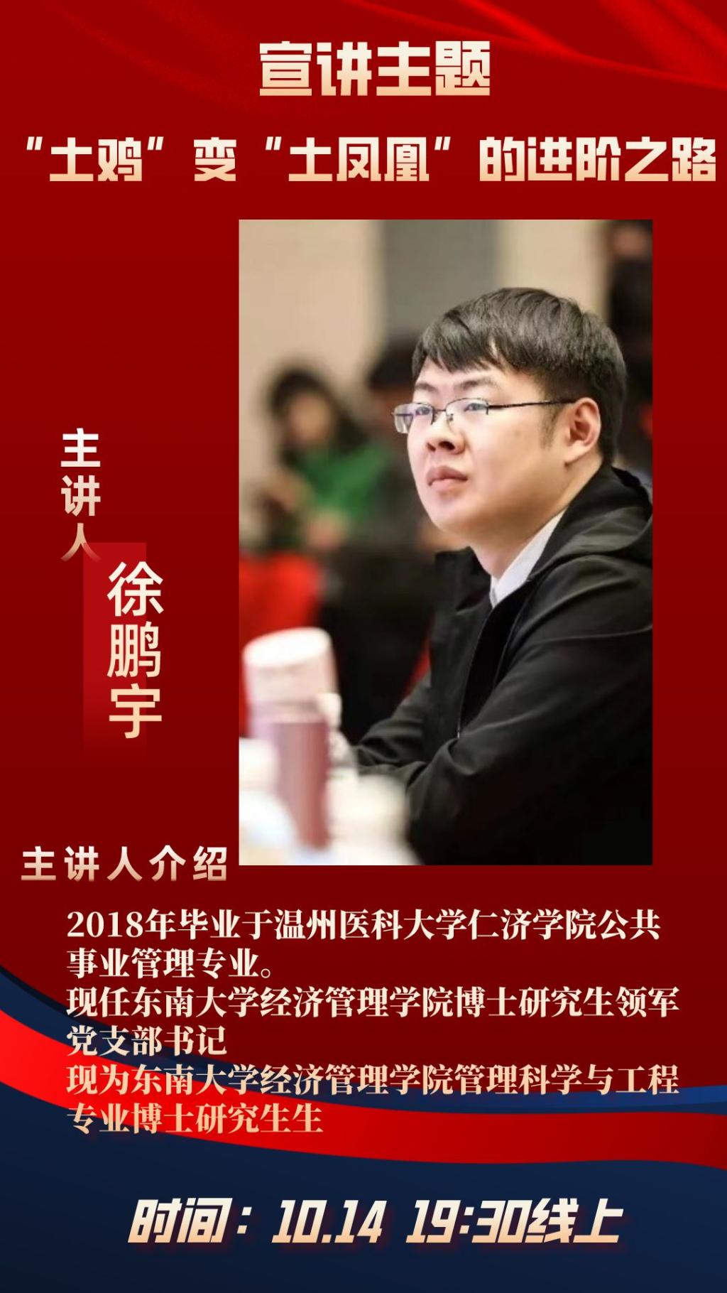 现任东南大学经济管理学院博士研究生领军党支部书记、曾就读于仁济公共事业管理专业的徐鹏宇学长分享了自己的有关经历。学长通过回忆往昔读书经历,感概自己的生活变迁,分享自己的人生经历。到讲座的最后,学长还以亚洲一种毛竹为例,“毛竹在最开始的五年几乎看不到它的成长,但是一旦突过五年这个时间点,它就会飞速生长。” 他希望同学们像这种毛竹一样,要“敢于尝试,勇于放弃,不甘平凡”,不断学习,不断成长。