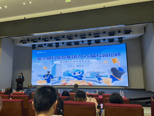 同日晚上,爱尔眼科2026届校园招聘宣讲会在育英学术馆二楼多功能会议室举行。宣讲会现场,爱尔眼科集团负责人系统地介绍了医院的发展历程、广阔的职业发展通道。我院校友结合自身飞速成长的经历现身说法,亲切真实的分享,点燃了众多临床医学、眼视光学、护理学等专业学子的加入热情。