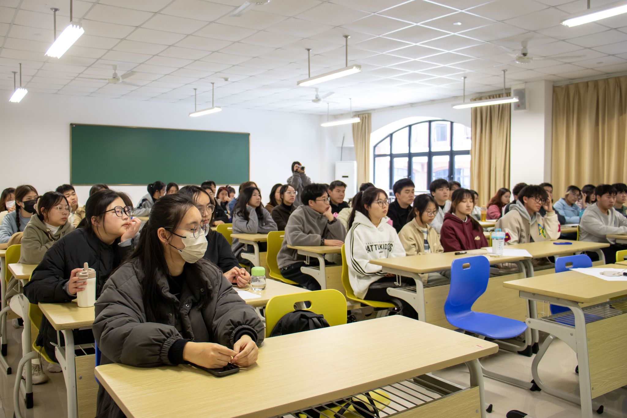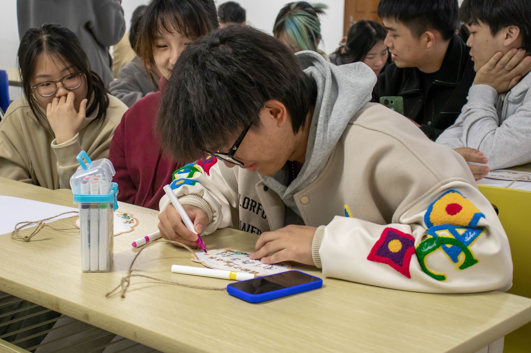 “‘天苍苍,野茫茫,风吹沙起好荒凉’,这原是一片沙地荒原,在三代塞罕坝人50多年的努力下,首都北京竖起了一道绿色屏障”,宣讲员向同学们分享了塞罕坝的故事,“112万亩林海、4.8亿棵树木,排起来可以绕地球12圈,蔚然而成绿色的海洋。”在一张张照片、一幕幕影片的直观感受下,同学们深受震撼。“塞罕坝林场建设者忠于使命,无私奉献,赢得了联合国环境署的‘地球卫士’的美誉,我们应该向他们学习,用实际行动守护来之不易的绿水青山”,现场一位同学说道。“游学+理论”的方式全方位拓宽了学生植物认知视角,在双重体验之后,同学们热情高涨,纷纷动手画出“我眼中的绿水青山”,还巧妙构思了“与树共舞”“植此青绿”等植树节创意标语。