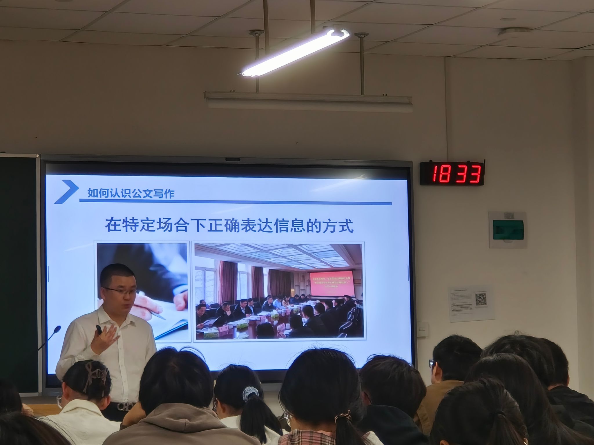 王老师在讲座中与同学们也分享了日常练习的方法,从逻辑出发,结合同学们的生活实际来分析,由浅入深,同学们受益匪浅。其中有同学表示:“通过这次培训,我学会了如何撰写清晰、简洁、有效的公文。培训中,我了解了不同类型的公文格式和写作风格,并学会了如何选择适当的词汇和句式来表达自己的意思。这次公文培训不仅增强了我的写作能力,也提升了我的沟通和表达能力,在工作和生活中都能够受益匪浅”。