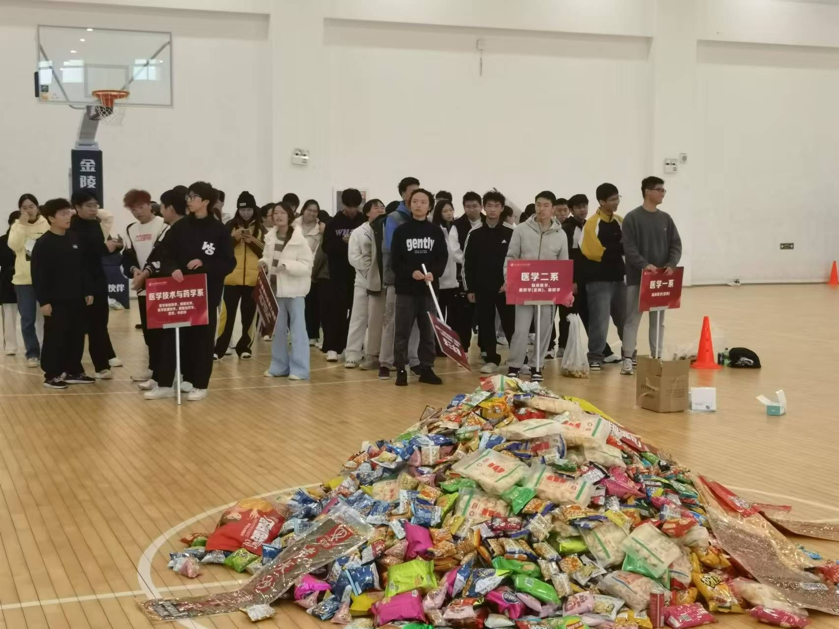 活动现场,体育馆内堆满了各式各样的零食,吸引了众多学生的目光。个人套圈比赛和拆盲盒环节更是将现场气氛推向高潮。学生们各显神通,彩圈飞舞,精准地套中一瓶瓶饮料,辅导员们也被这欢乐的氛围所吸引,纷纷加入套圈的队伍,与学生们一同享受这份难得的轻松与快乐。周围的学生则为自己的辅导员呐喊助威,欢声笑语不断,笑容在每一个人的脸上绽放。