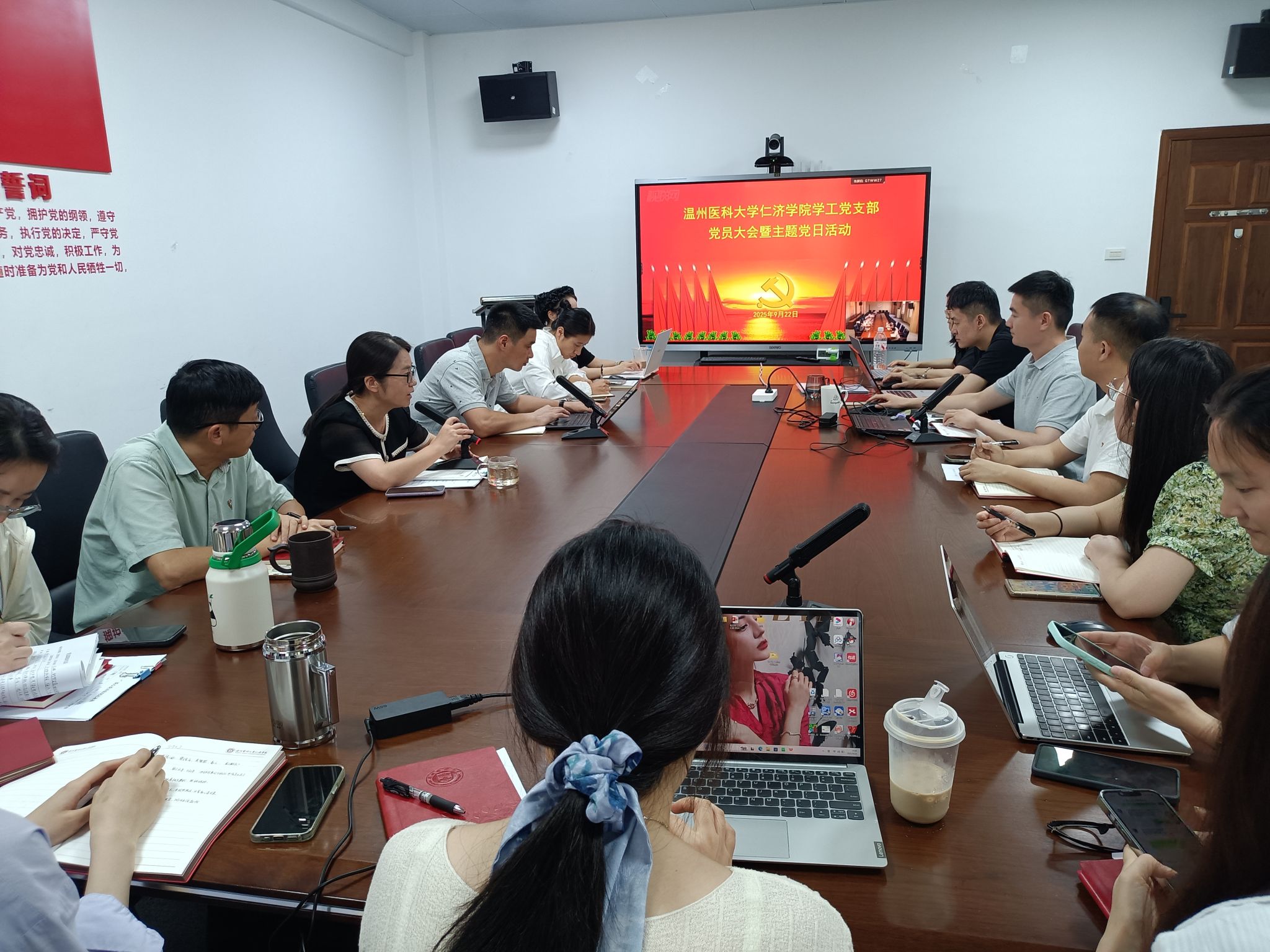 9 月 22 日,学工党支部召开党员大会暨主题党日活动,总结支部深入贯彻中央八项规定精神学习教育工作情况,进一步加强党员思想政治教育,推动作风建设常态化长效化。本次活动由支部书记姜旭英主持,全体党员参加。