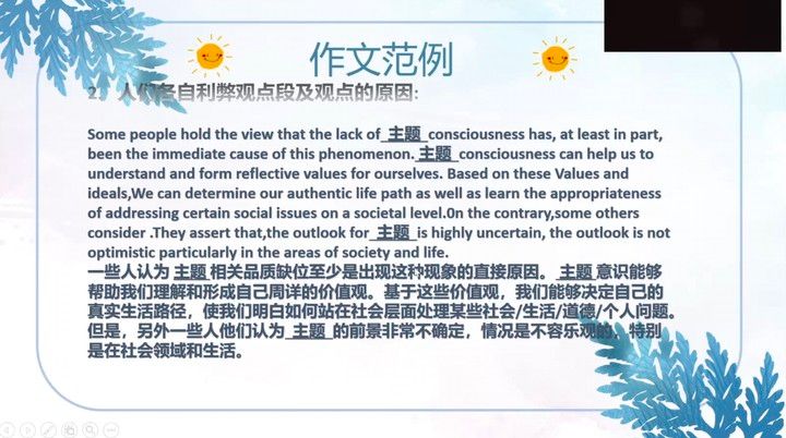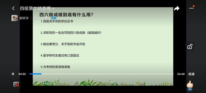 来自22级中医学专业的“小老师”周心驰,曾获得英语四级考试594分,六级考试583分的优异成绩。她首先简要讲述了备考的重心,带领同学们理清全卷的重难点,提高了同学们的备考效率。随后,她分享了自己的应试经验与做题技巧。例如,做听力时要做到视听结合和同义词替换,强调做到这点就要注意平时词汇的积累。面对翻译题这一“拦路虎”,“小老师”还贴心地罗列了许多重点词汇以及翻译模版,供同学们学习参考,为同学们的备考提供便利。