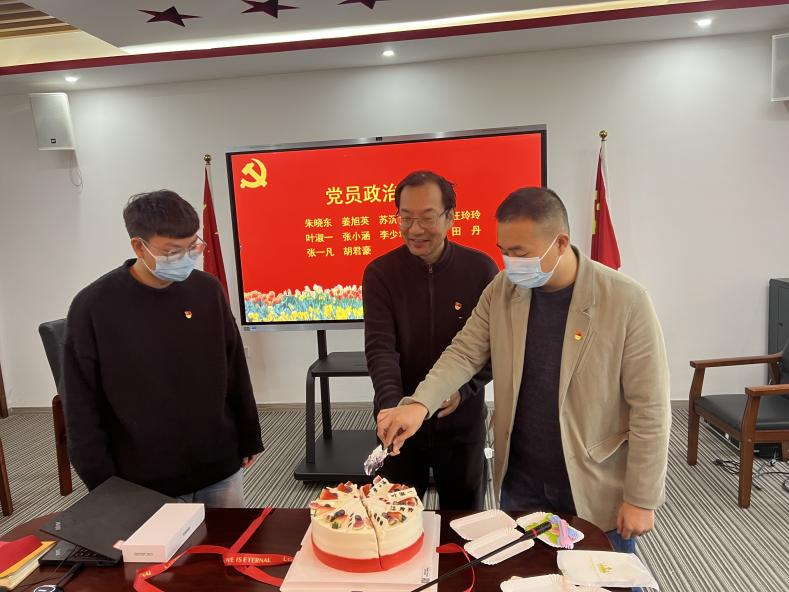 最后,支部为下半年入党的12名党员同志过“政治生日”,送上支部精心制作的生日贺卡。并由支部党龄最长的朱晓东副院长带领张一凡、胡君豪为大家分切蛋糕,将蛋糕分发到每一位党员手中,一起过政治生日,把活动氛围推向了高潮。