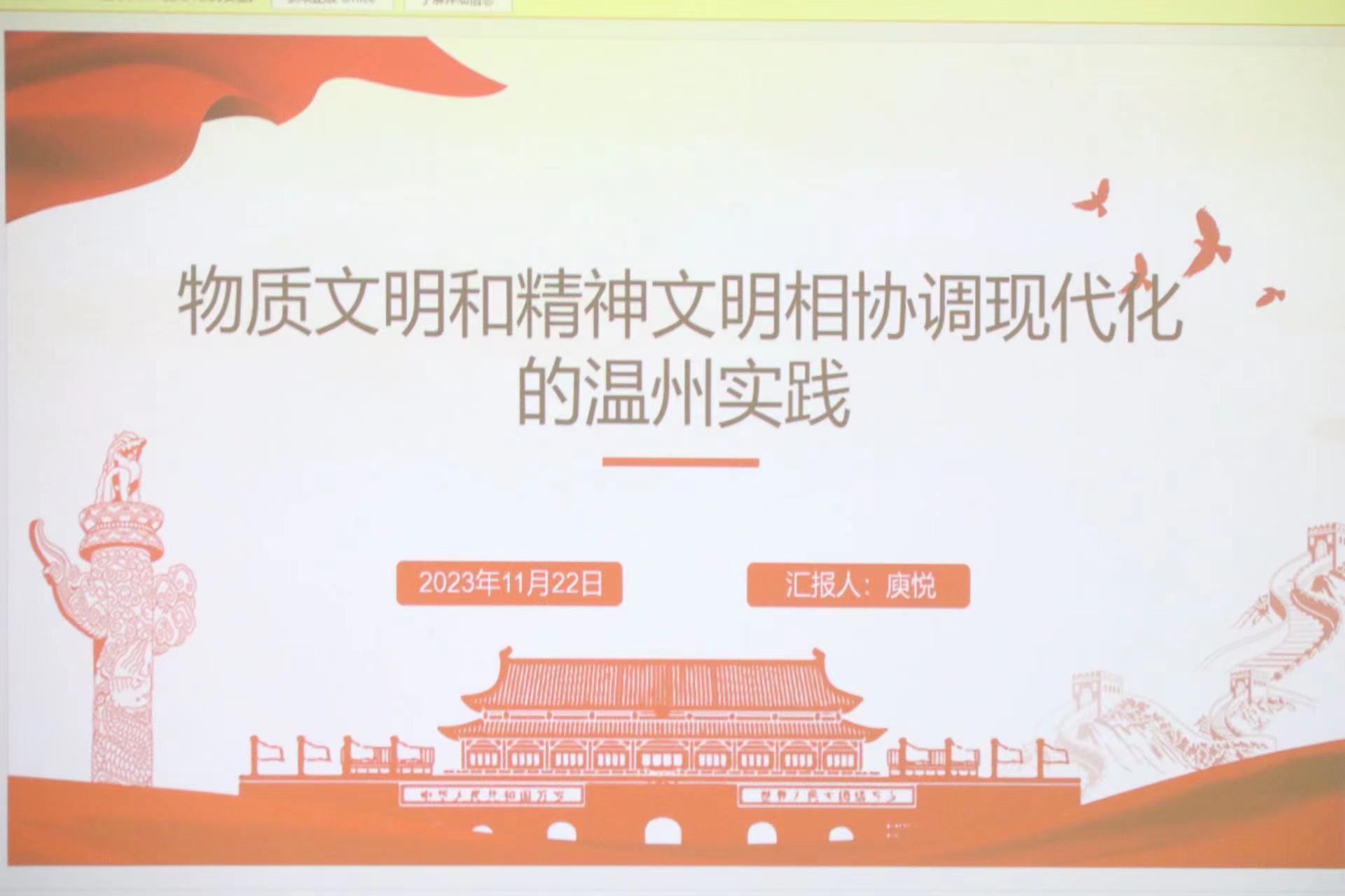2023年11月22日晚六点三十分,党建服务与人才培训中心在滨海校区开展了以“物质文明和精神文明相协调现代化的温州实践”为主题的一周看时事活动。主讲人从“温州的物质文明发展倾向”、“温州的物质文明发展过程”、“新时代温州争做社会主义现代化先行市”、“温州的物质文明与精神文明的关系 ”四个角度进行讲述。