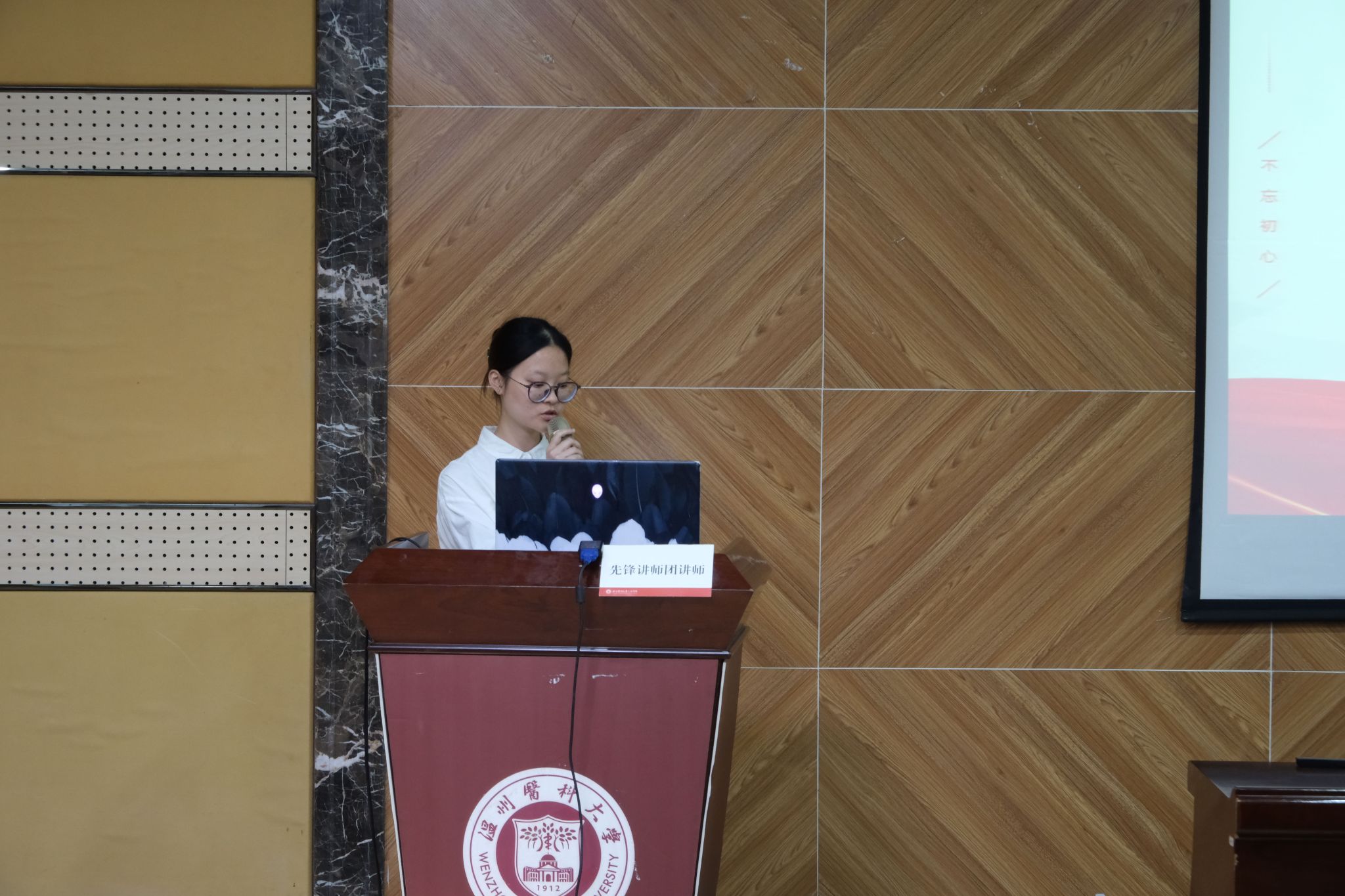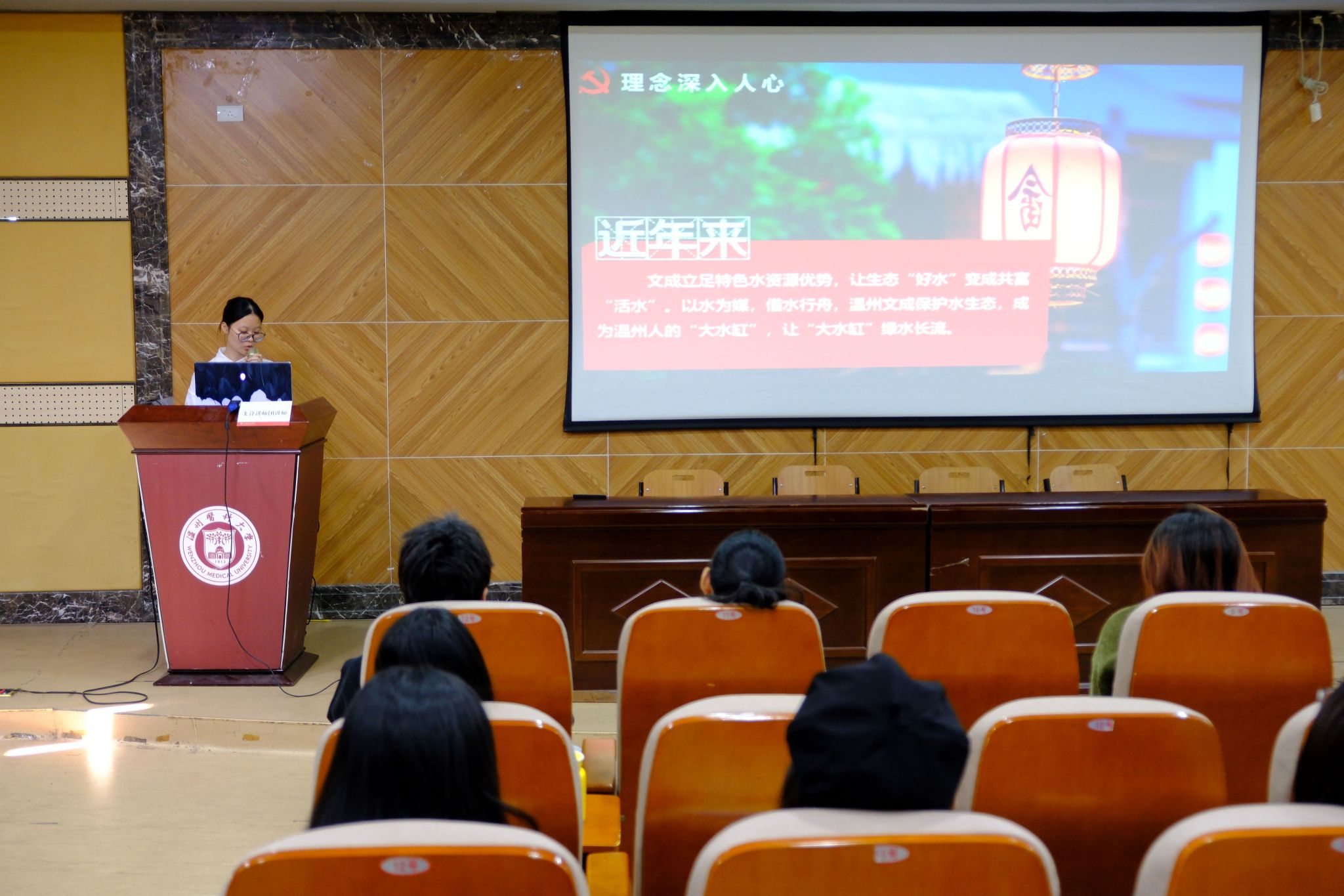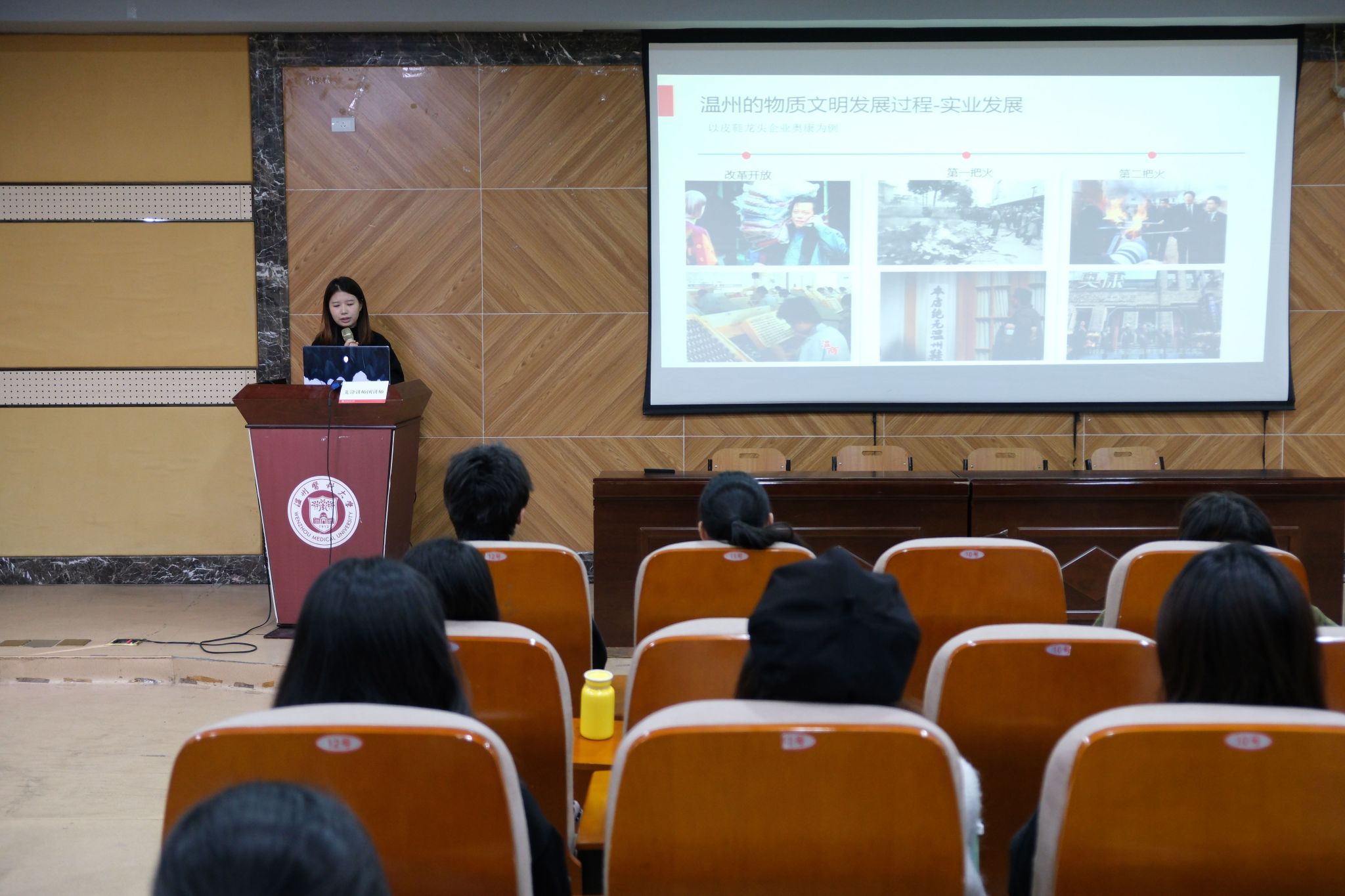 主讲人郑逸逍瑶同志以“物质文明和精神文明相协调现代化的温州实践”为主题,为同学们讲述物质文明和精神文明相协调这一现代化特征在温州的具体体现。在解放初期温州的问题可以概括为两少一差:可利用自然资源少,人均耕地少,交通条件差,但主讲人通过多个事例讲述温州在温州人民的努力下发生的巨大变革,随后主讲人通过奥康和炒房团两个事例,强调了讲功利又讲诚信的道德面貌才能支持物质文明的长足发展, 而在炒房团的事例中,无论是缺少经济文化与法律教育而盲目的跟风炒房或是大头部队损人利己的主动炒房,这两种不协调的精神文明都导致了最终物质文明的崩塌。最后主讲人指出如果把城市比作人,温州就像我们普通人,资历一般,长相平平,白手起家,唯有丢掉幻想,脚踏实地,才能走好眼前的道路。