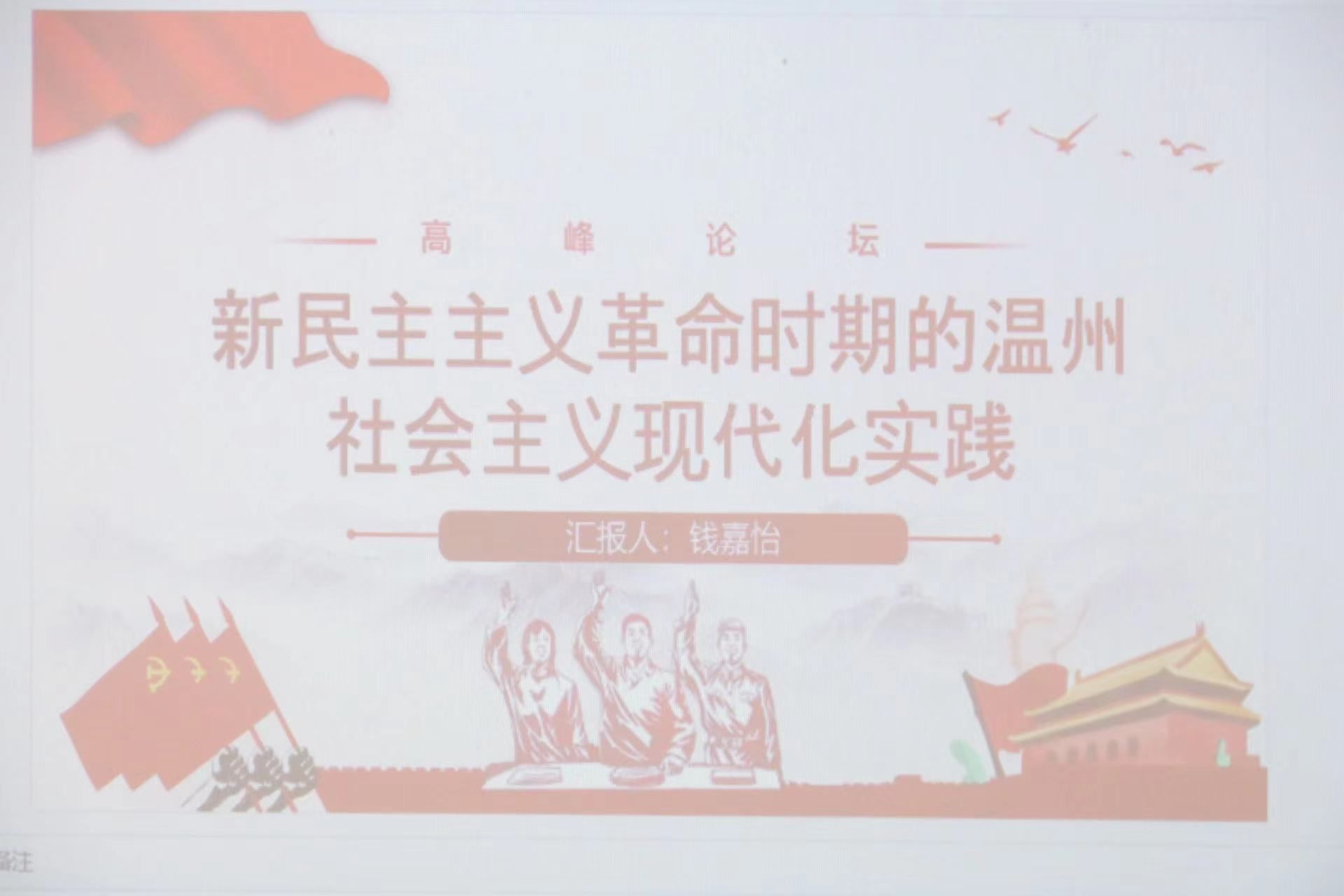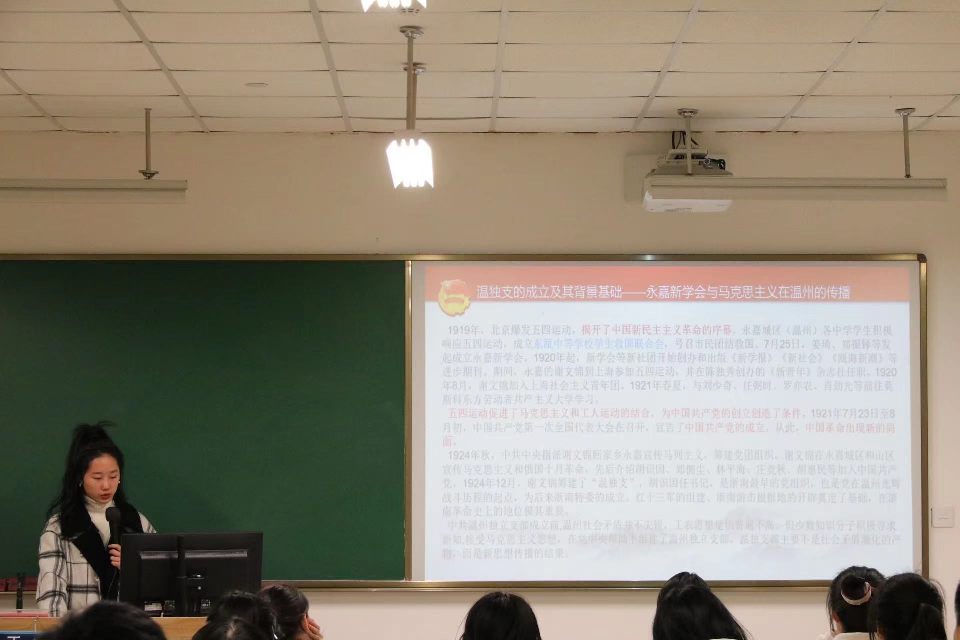 2023年11月24日,黄瓜视频 党建服务与人才培训中心在滨海校区进行了一周看时事活动。钱嘉怡同学围绕“新民主主义革命时期的温州社会主义现代化实践”这一主题来展开。新民主主义革命时期我们党团结带领人民浴血奋战、百折不挠,经历北伐战争、土地革命、抗日战争、解放战争,推翻了三座大山,建立中华人民共和国,实现了民族独立、人民解放,为实现现代化创造了根本社会条件。