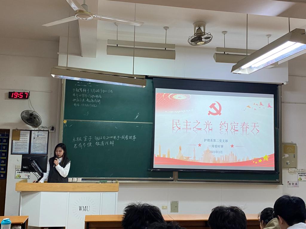 2023年3月22日晚八点,党建服务与人才培训中心分别在茶山校区7AJ102、7AJ103开展了以“民主之光,约定春天”为主题的一周看时事活动。主讲人从两国两会、国家建设、未来发展三个方面进行讲述。