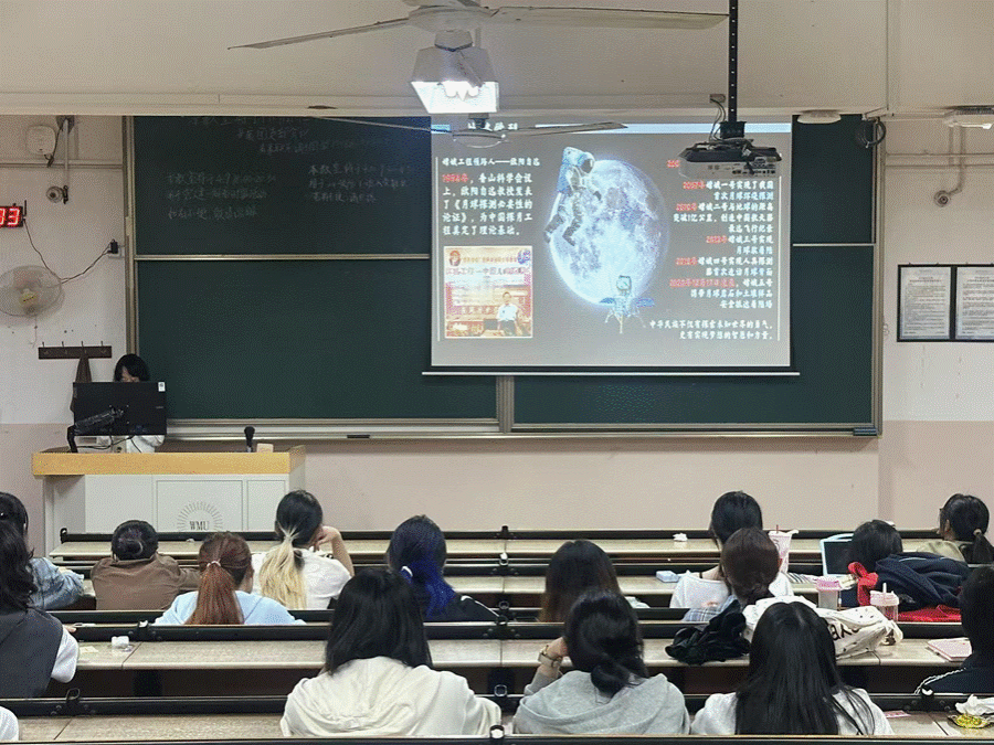 2025年4月9日晚,党建服务与人才培训中心于茶山校区6A307和6A308教室开展了一周看时事活动。主讲人以“‘嫦娥’揽月照初心,青春向党逐星辰”为主题,带领大家回顾了中国探月工程二十年的辉煌历程,展现了中华民族自强不息、勇攀高峰的精神风貌和追求卓越、敢于胜利的信念追求。