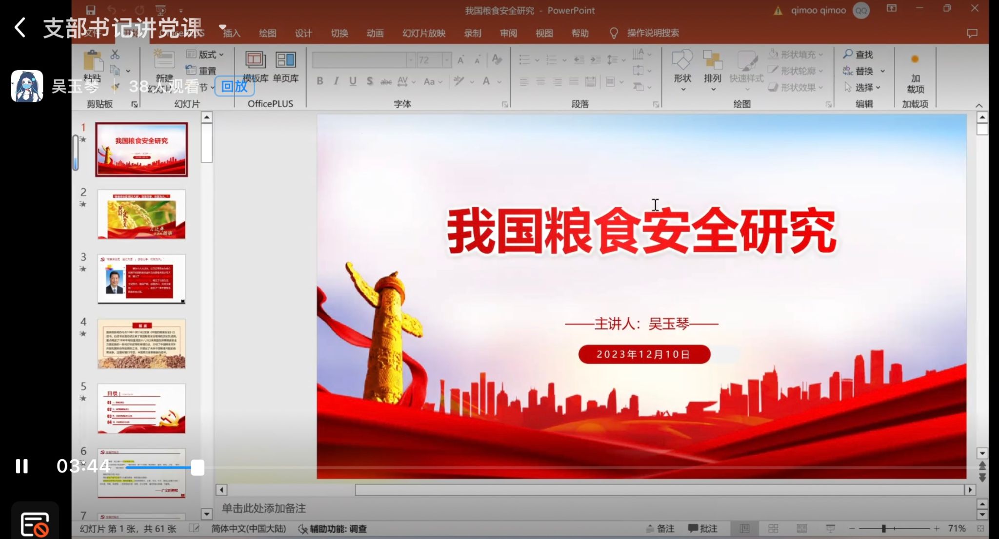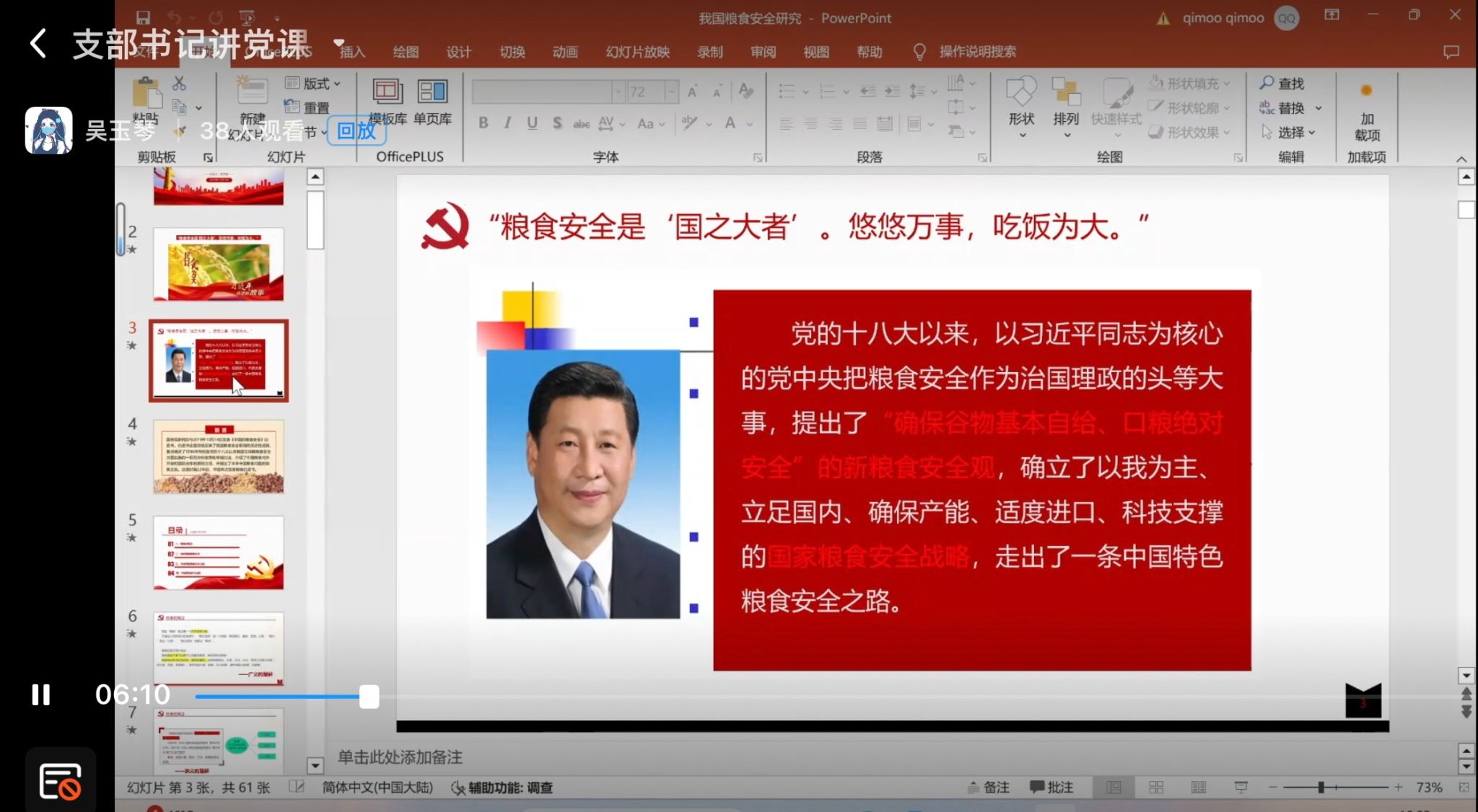 民以食为天。为深入学习贯彻习近平总书记关于国家粮食安全的重要论述精神,在支部成员中加强粮食安全宣传教育,引导支部成员增强惜粮意识,护理系第一党支部于12月11日晚以钉钉直播的方式开展了云端党课,本次党课由支部书记吴玉琴老师主讲。
