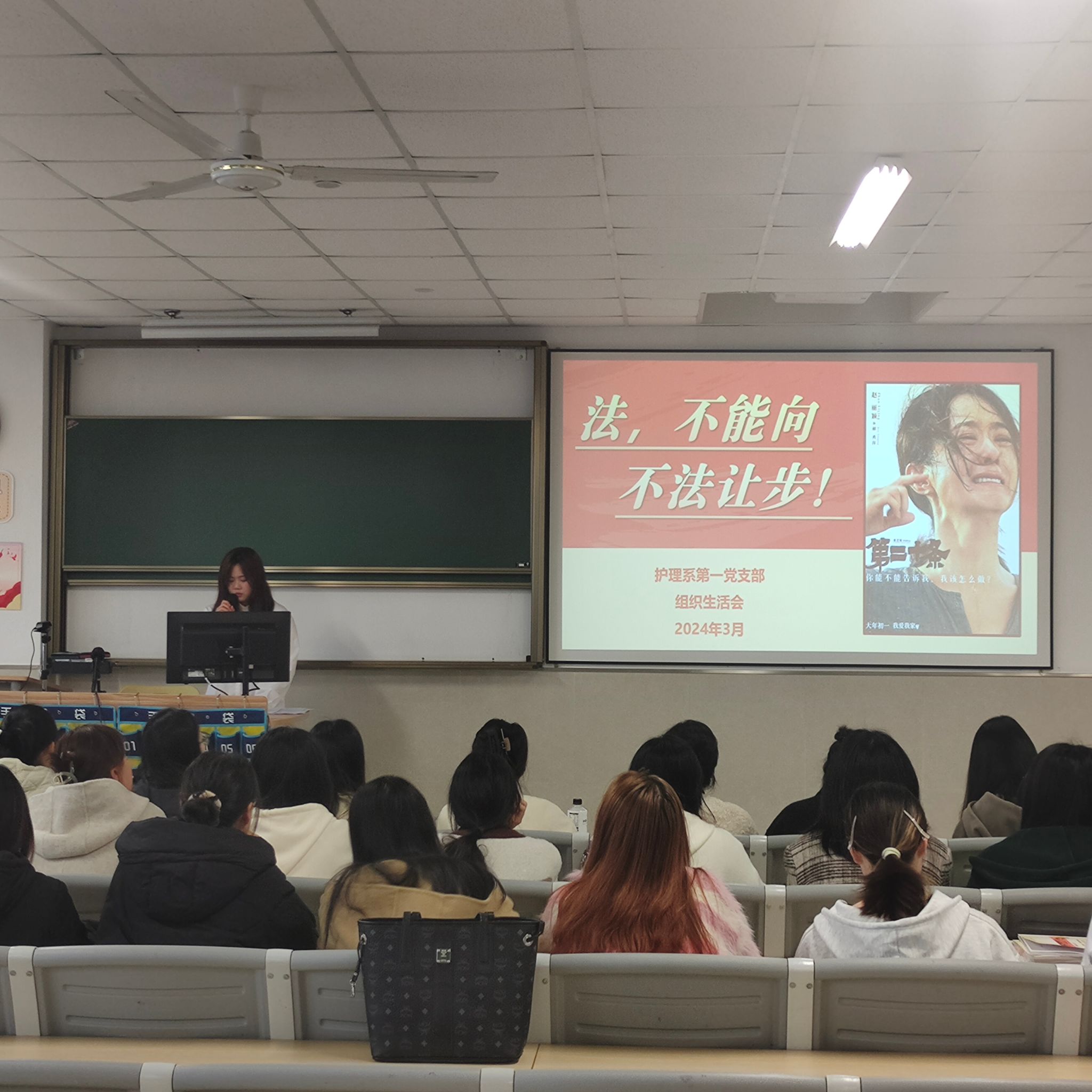 为进一步深入学习贯彻习近平法治思想,弘扬社会主义法治精神,2024年3月16日下午15:00以及3月17日下午13:30,护理系第一党支部、护理系第二党支部分别在滨海校区1301教室、茶山校区7AJ202教室和钉钉线上举行组织生活会。本次组织生活会的主题是“法,不能向不法让步”,由罗垭瑄同志、胡丽娜同志担任主讲人。
