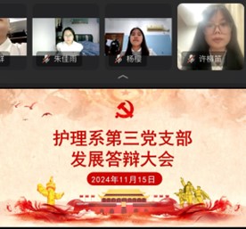 为了进一步加强学生党支部的建设,提高党员队伍的整体素质,为支部输入新鲜力量,黄瓜视频 护理系第三党支部于2024年11月15日18:00在钉钉线上召开发展答辩大会。本次发展答辩大会由汪玲玲老师主持,出席大会的有护理系第三党支部书记汪玲玲老师和全体学生党员,以及参与答辩的六名入党积极分子。