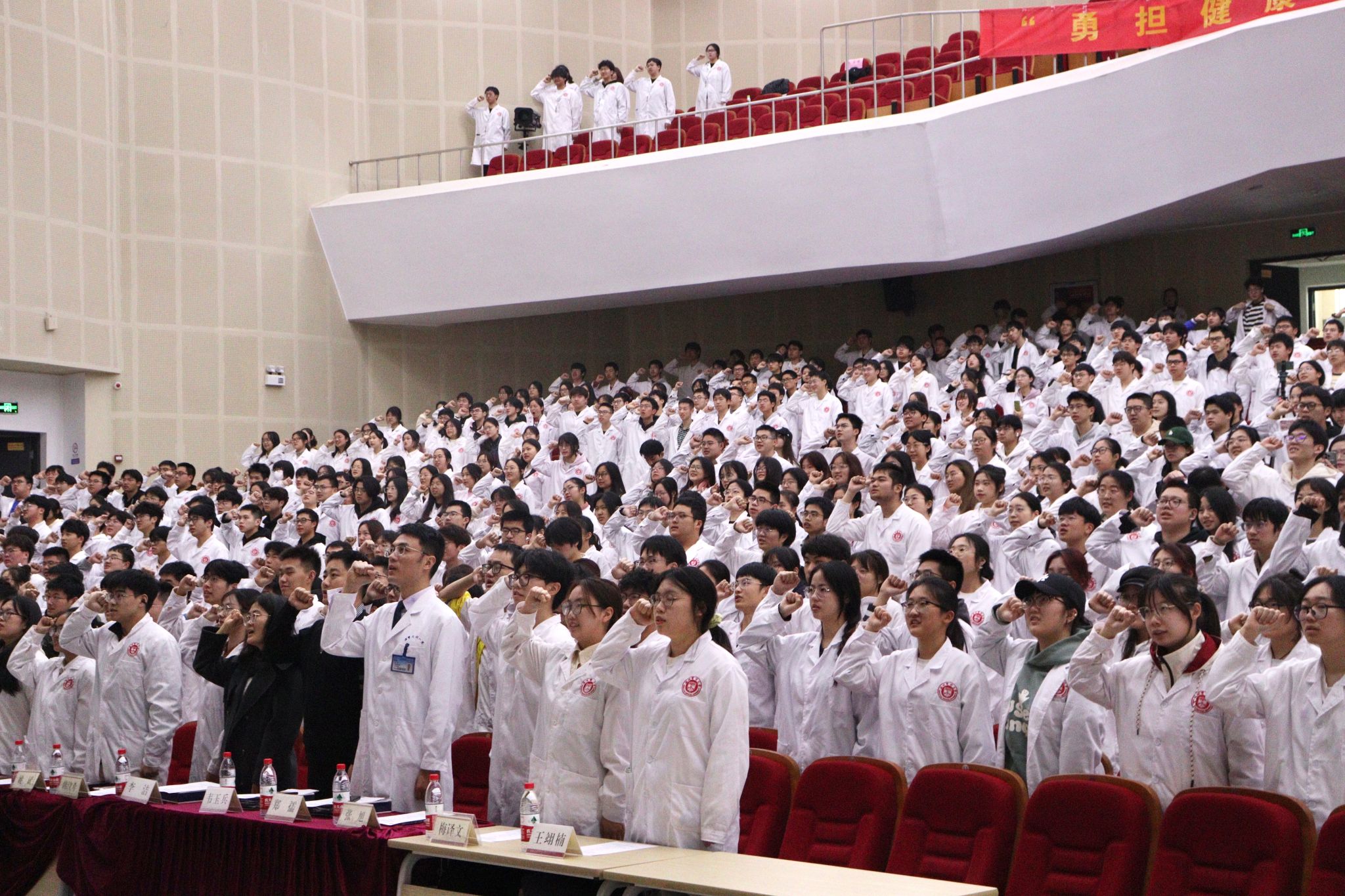 随后,活动来到白大褂授予仪式和医学生宣誓誓词。学生代表从郑孺医生手中接过神圣高洁的白大褂,郑孺医生为其整理衣冠,在此过程中,新生们感受到前辈的殷殷期盼,这是行医路上责任感的传承。而后,新生们在三位领誓人的带领下,整齐划一地举起右拳,“健康所系,性命相托!”铿锵有力的声音响彻会堂,展现出新生们对医学事业的无限憧憬与敬仰,彰显出他们将坚定使命、不忘初心的决心,也逐渐增强在座同学对于医疗工作者的身份认同,而这种认同感将成为他们在未来职业生涯中不断前进的动力源泉。