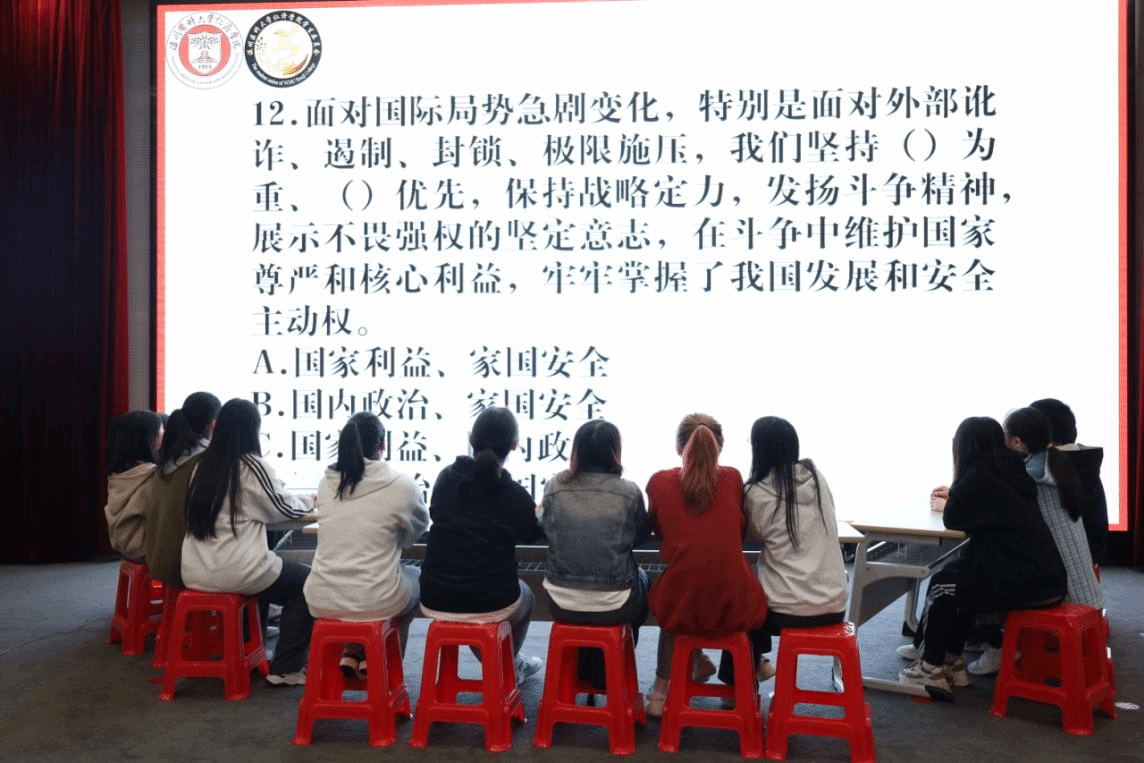 4月14日晚,总决赛在滨海校区仁心厅举办,各系代表发表赛前宣言,表达了践行两会精神、展示新时代青年责任的决心。比赛中,各队伍通过接力答题的形式展开激烈竞争。答题环节包括单选、多选及填空题,考验选手们的应变能力和团队协作。
