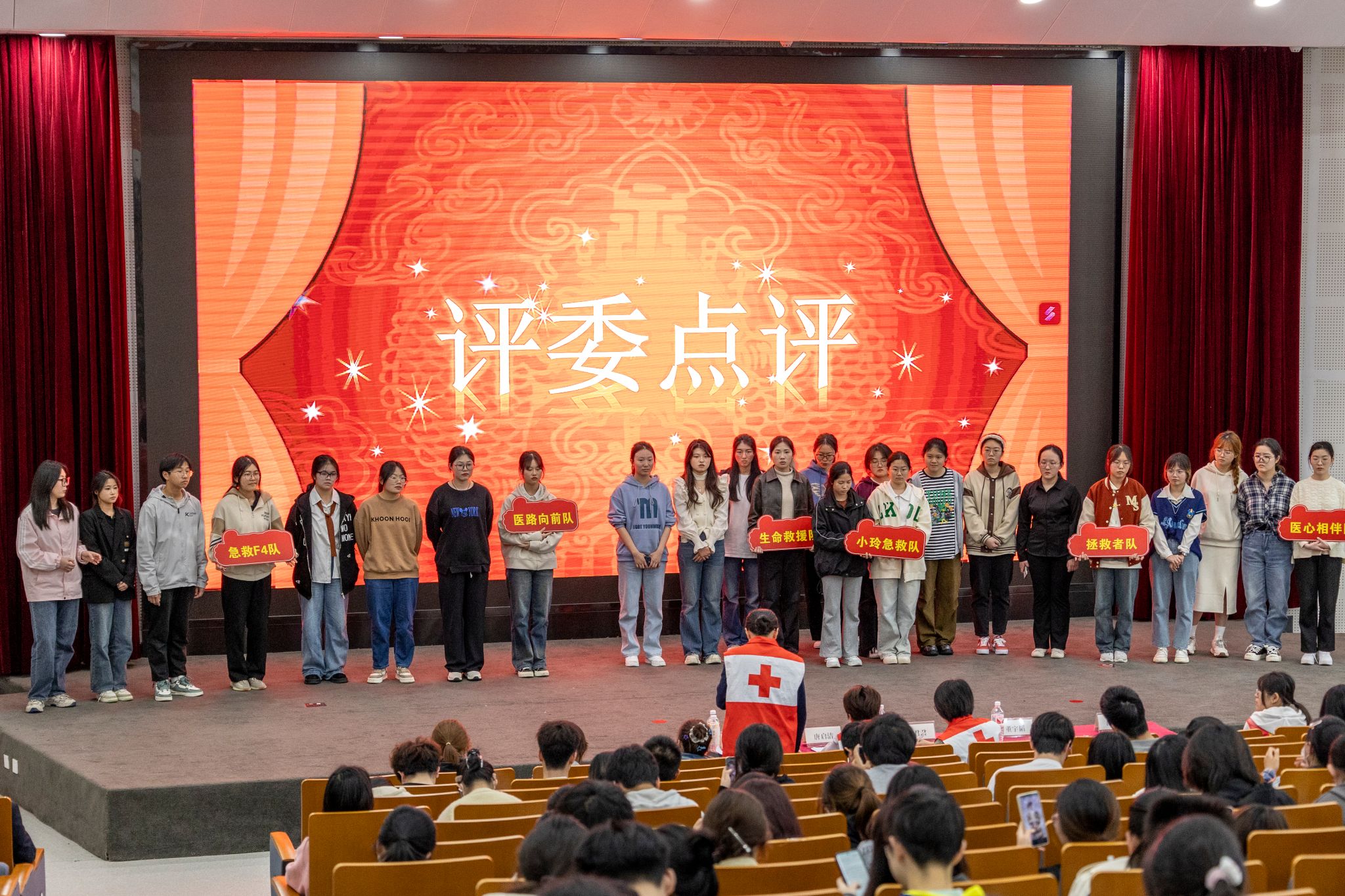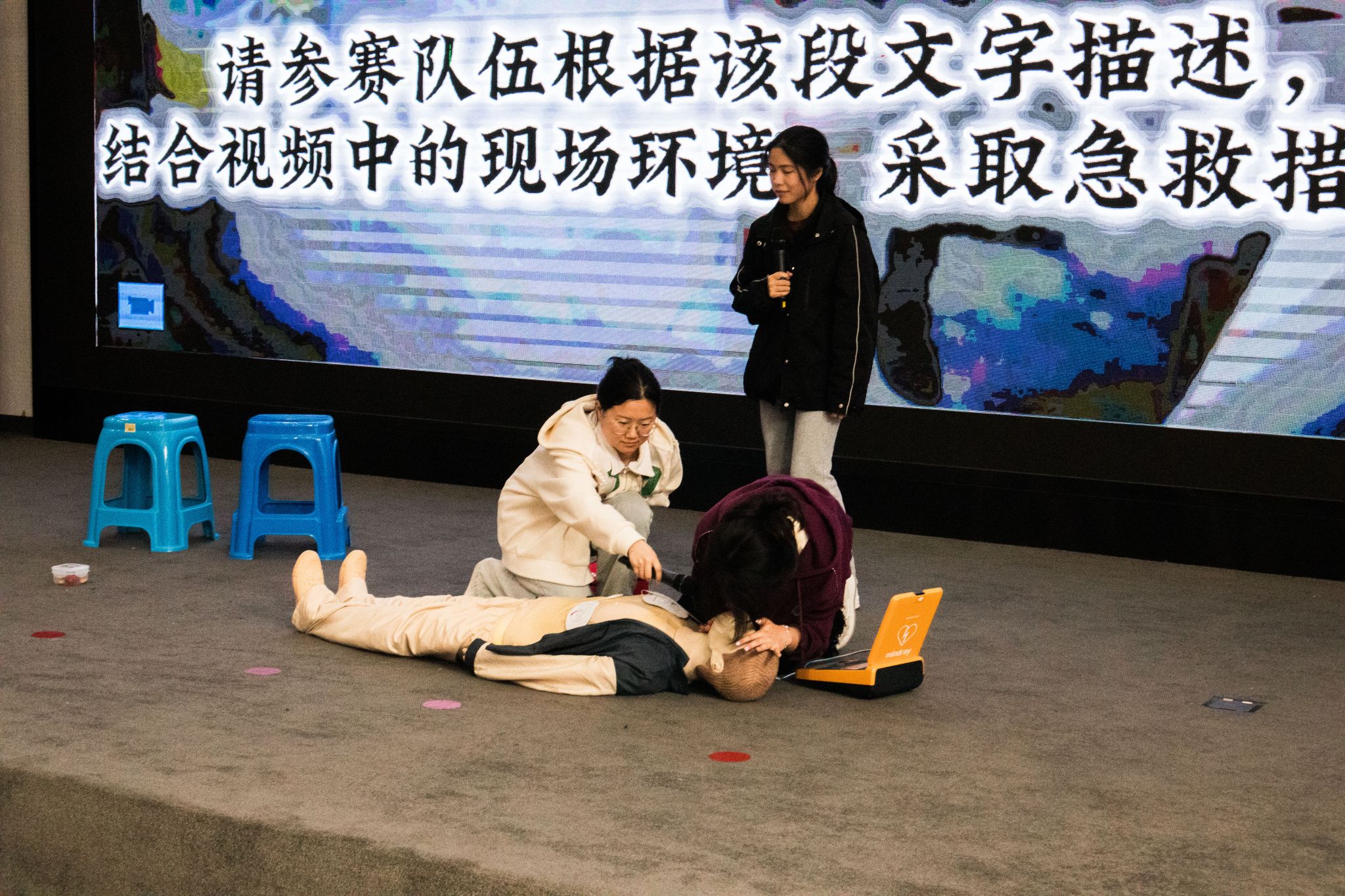 当比赛进入即兴情景演绎环节时,现场气氛达到了高潮。这一环节涵盖了异物梗阻、溺水、癫痫、触电、地震、车祸六大真实情景视频。各队伍依次抽取情景,模拟现场救援。选手们凭借娴熟的实操技能、默契的团队配合和体贴的人文关怀,成功完成了各项挑战,赢得了现场观众的热烈掌声。