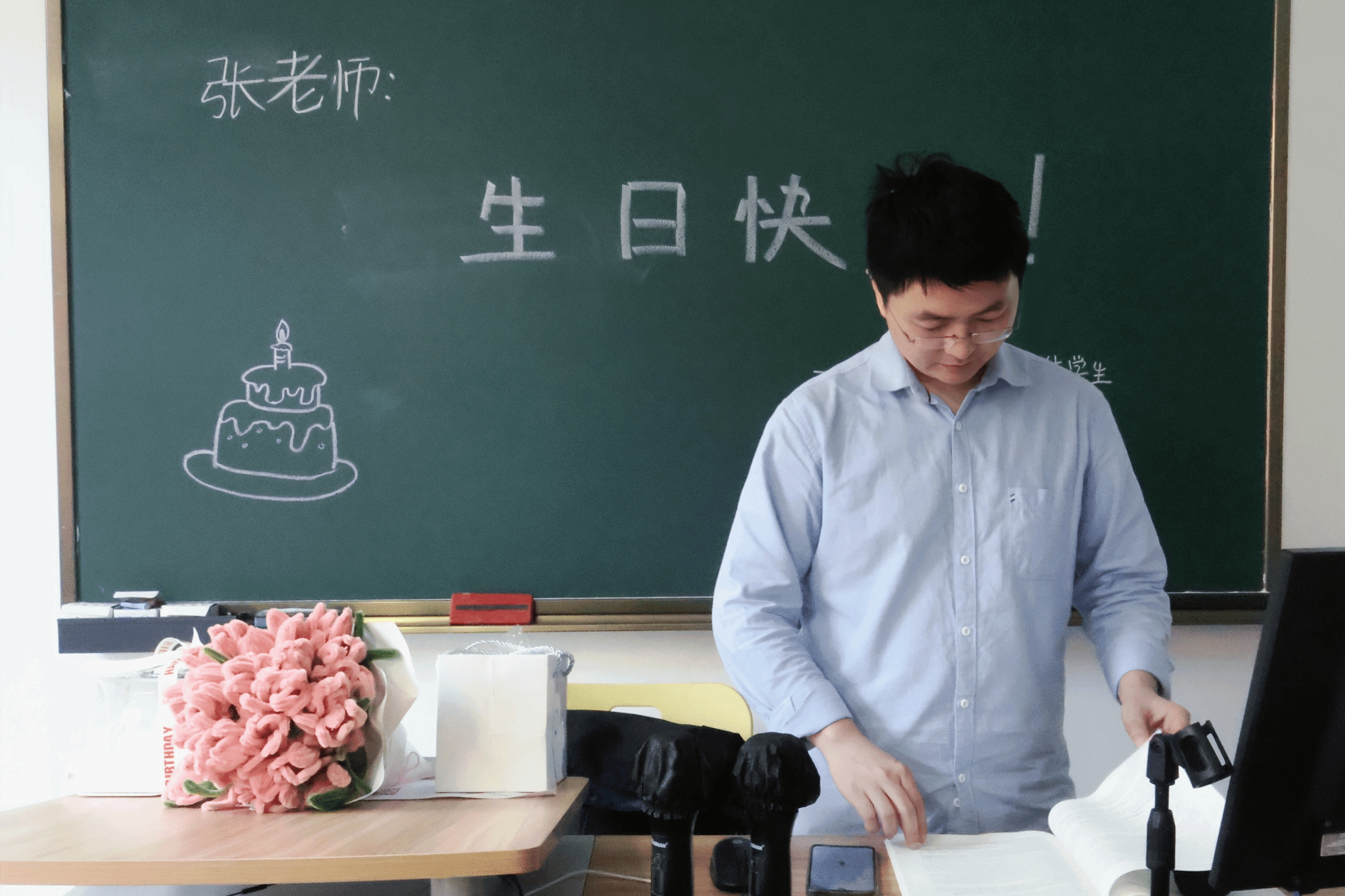 康复一班、二班的同学们利用课余时间一起学习了扭扭棒的制作方法,每个人制作了一支郁金香。4月26日早上十点,恰是新雨初晴之时,当张老师如常提前来到教室前准备上课时,两班的代表小跑着送上了一束同学们手工制作的郁金香和生日蛋糕。教室内的黑板提前画上了生日祝福板报,同学们齐声高呼:“老师,生日快乐!”。虽然这是一个简单的仪式,但是也让张老师感受到了来自同学们的心意。
