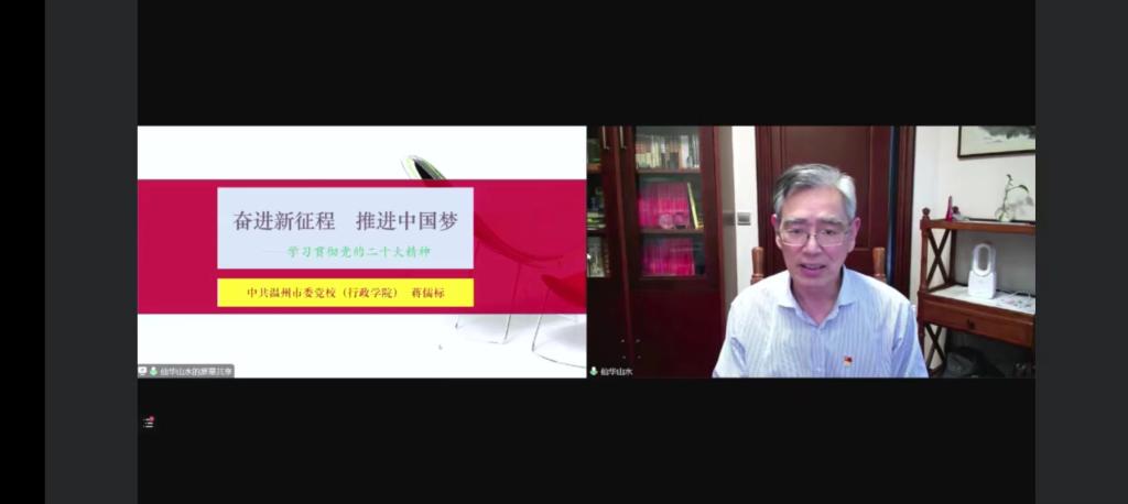 来自温州市委党校的蒋儒标教授做了《学习宣传贯彻党的二十大精神》《国内外形势分析》的讲座。讲述了在党史、新中国史、改革开放史、社会主义发展史、中华民族发展史上具有里程碑意义的事件。回顾党的百年奋斗历程,站在新的历史节点继往开来,面向未来。蒋教授带领同学们深入学习党的二十大精神,并以此为纲深入分析国际国内形势,解析了党的“两个确立”“十个明确”“十四个坚持”的重要性。细致的讲解、耐心的教导,对于同学们坚定历史自信、增强历史主动,守正创新、勇毅前行发挥着重要的鼓励和引导作用。