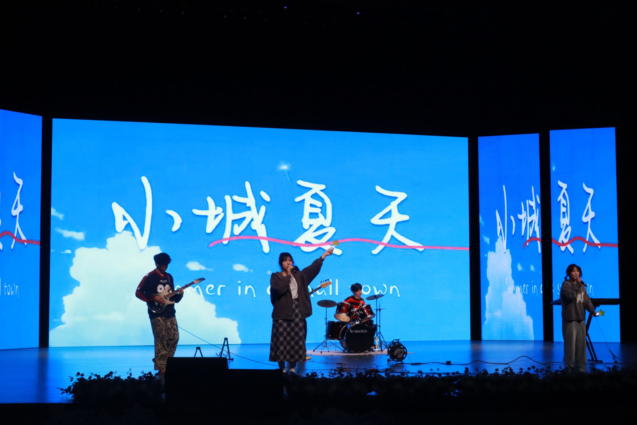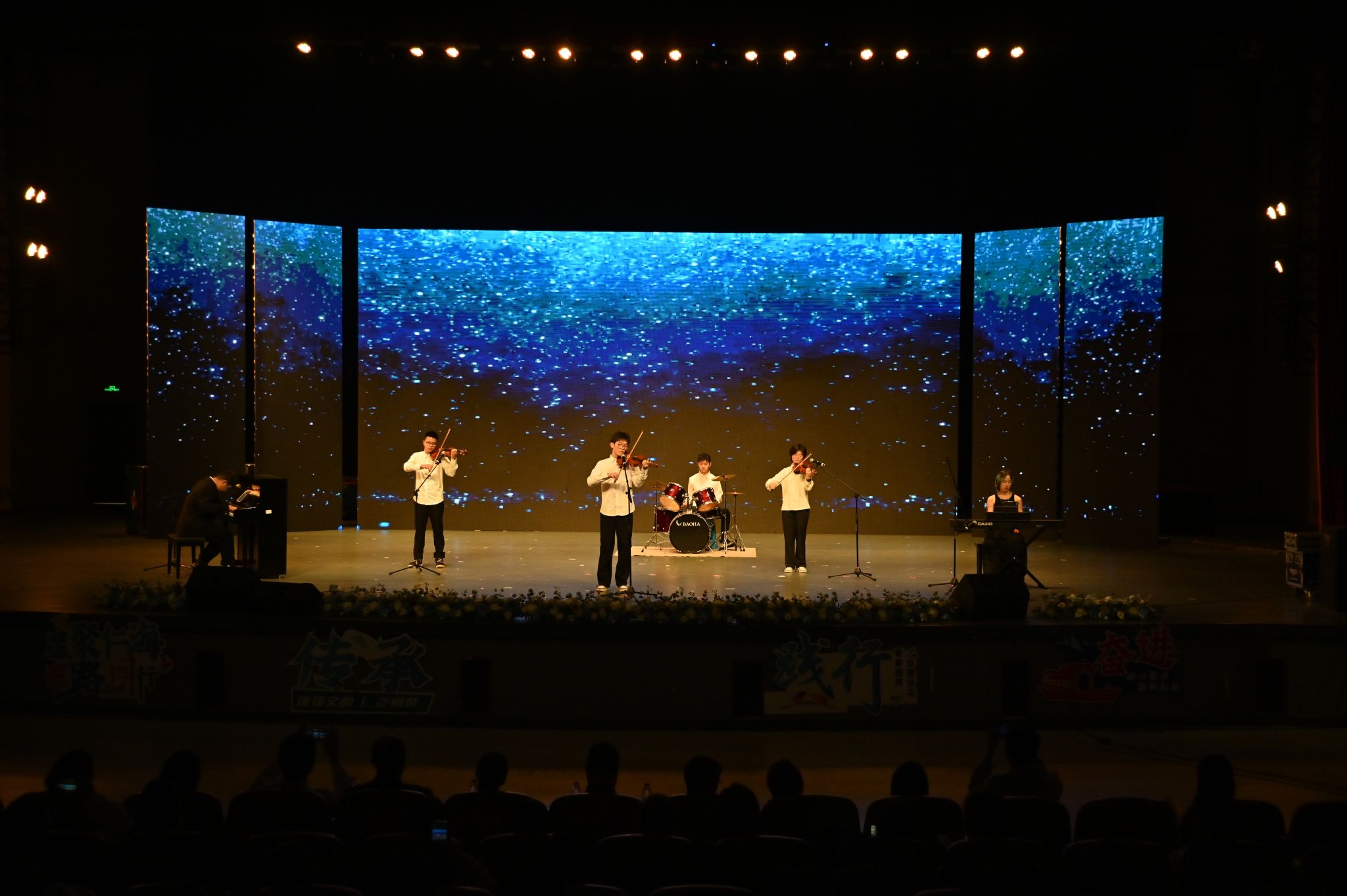 乐队演奏的《小城夏天》作为开场曲,以其欢快的旋律迅速点燃了现场的热情,晚会在一片星光熠熠的热烈氛围中正式拉开帷幕。《溯跃》表演者们在舞台上如红色的锦鲤游动,轻盈自如,缓缓递进的音乐也使同学们沉浸当中。器乐合奏《九州同》以其宏大的气势和细腻的情感,让在场的每一位观众都感受到了中华民族文化的博大精深。而《星辰大海》在舞曲相融的生动演绎中传递了对未来的无限憧憬与希望。