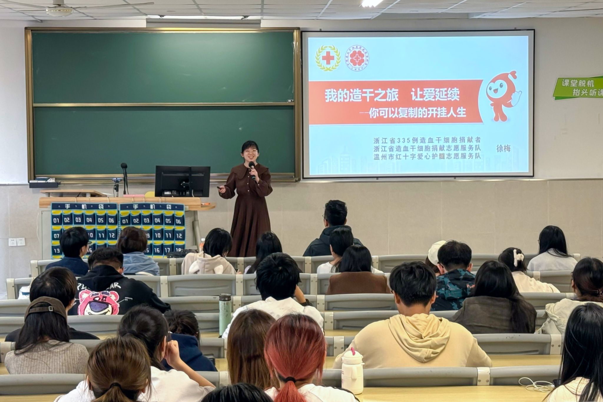 11月15日下午2时,学院在滨海校区至理楼2405教室举办了以“献血铸爱,生命续航”为主题的献血讲座。本次讲座荣幸邀请到了温州市中心血站的专家团队,包括应涨涨、林晓非、徐梅三位老师,为在场的学生们详细阐述了三献(献血、献浆、献器官)及造血干细胞捐献的相关知识。