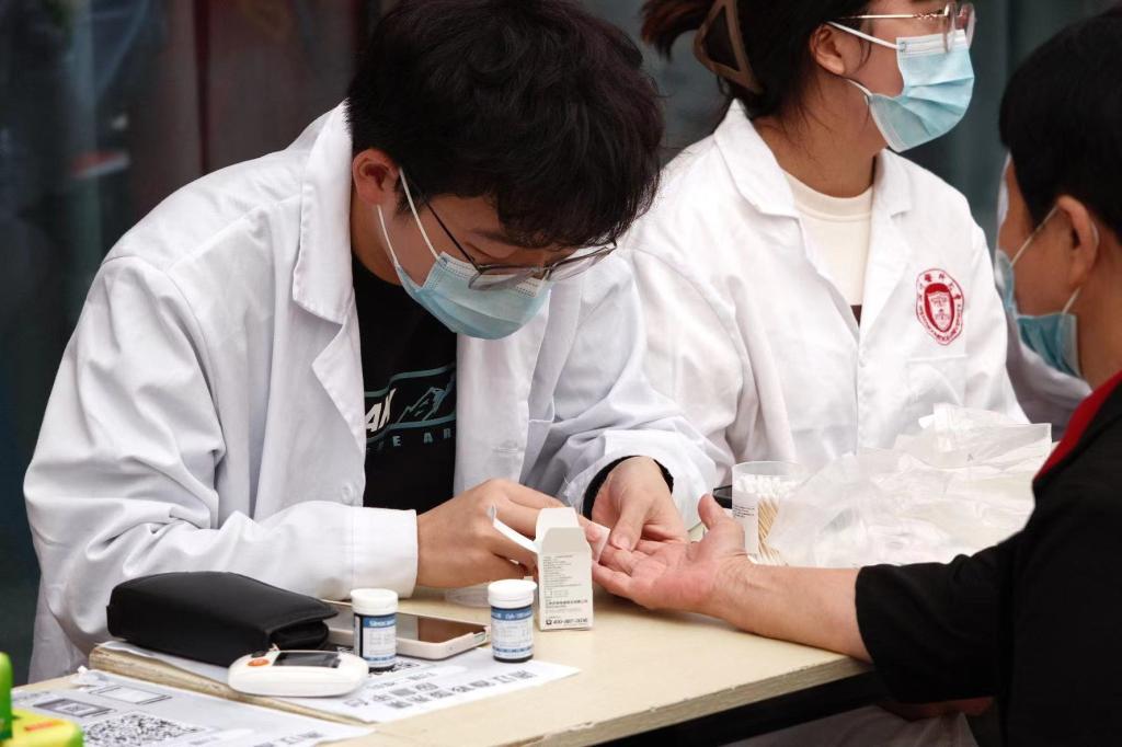 为确保活动的顺利开展,全科一系1班的同学们早早来到社区,按照义诊区与咨询区布置活动现场。活动开始,同学们发挥自身医学专业优势,为辖区居民免费测量血压、血糖、普及健康知识等,仔细为每一位居民检查基本的身体状况,对所患疾病进行详细解答、对生活方式和健康状况进行评估,使其能及时准确地了解自身的健康状况。做到疾病早发现、早预防、早治疗,从而进一步提升健康理念,增强防范意识。