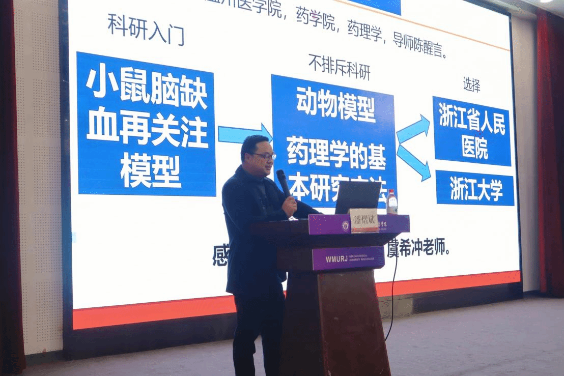 在“求学叙事”环节,潘博士以平易近人的姿态,讲述了他从新昌制药厂质检实习的基层经历,到实验室中通宵达旦的科研攻坚,再到省级医院科研与临床相结合的探索之路。十年间,他不仅在国际顶级期刊发表多篇论文,还成功获批2项国家自然科学基金项目。这一历程不仅印证了“板凳要坐十年冷”的科研真谛,更向师生传递了坚持与积累的重要性。
