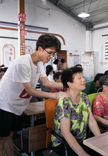 同时,实践队队员们为现场老人送去按摩、艾灸等惠民义诊服务,“奶奶这个按摩力度可以吗?会不会太重啦?”“哎呦小伙子,可以这个力度可以,太舒服啦!整个肩膀都放松了……”奶奶坐在椅子上,享受着队员们带去的按摩服务。实践队员们一边按摩,一边叮嘱爷爷奶奶们要注意健康饮食、规律休息、适量运动,养成良好的生活习惯,并贴心地为老人分发牙膏、毛巾、艾灸贴等物资。