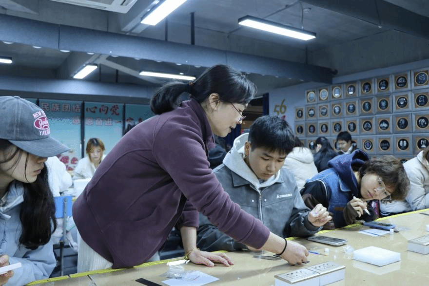 在东海贝雕艺术博物馆,学员们沉浸式感受省级非物质文化遗产——洞头贝雕的巧夺天工,详细了解其发展历程、技法演变及现代创新应用。在博物馆工作人员的指导下,学员们亲手体验贝堆造景、梅兰竹菊书签体验等工艺,感受海洋文化与工匠精神的深度融合。此次研学活动中,曾担任一年多贝雕博物馆讲解志愿者的朱同学表示:"再次回到贝雕博物馆倍感亲切,希望更多的游客能够来到贝雕博物馆,了解贝雕螺钿工艺的发展历史及精美工艺,让螺钿技艺既能传承发扬,又能创新发展。"
