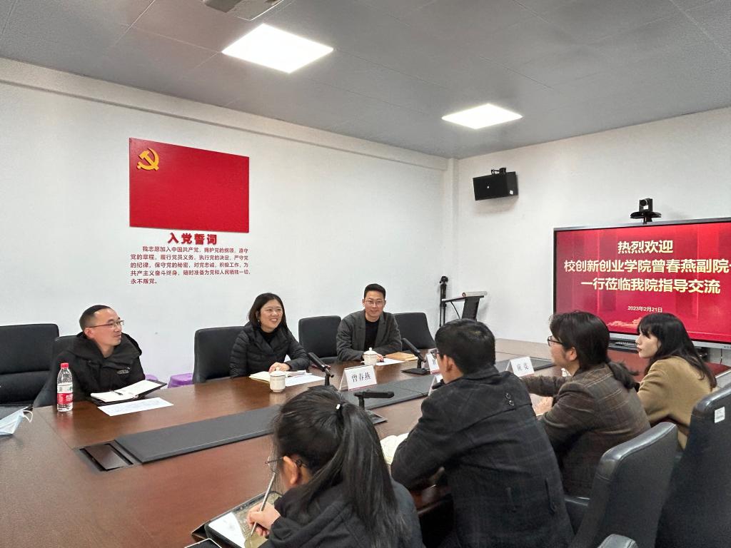 2月21日下午,校创新创业教育学院副院长曾春燕一行来我院走访调研。学院党委副书记姜旭英出席座谈会,创新创业教育学部负责人、本年度“互联网+”项目参赛学生团队负责人等参加座谈交流。