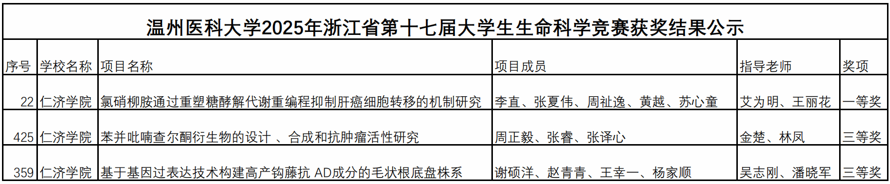 浙江省第十七届大学生生命科学竞赛获奖名单近日公布,我院学子凭借扎实的专业积累和创新实践能力,在竞赛中斩获佳绩,共荣获1项一等奖和2项三等奖,充分展现了学院在生命科学领域的教学成果与科研实力。