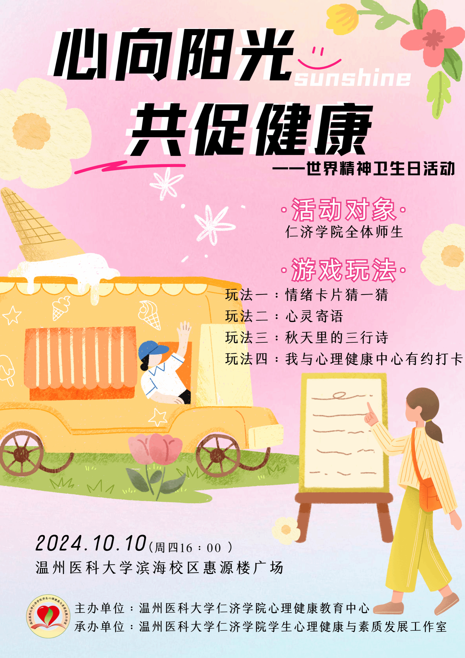 近日,我院学生心理健康与素质发展工作室在惠源楼广场举办“心向阳光,共促健康”世界精神卫生日主题活动。本次活动受到了学生们的热烈响应,百余名学生参与其中。据悉,院心工举办此次活动旨在提高我院学生心理健康和精神卫生意识,营造积极向上的校园文化,推动我院心理健康发展。