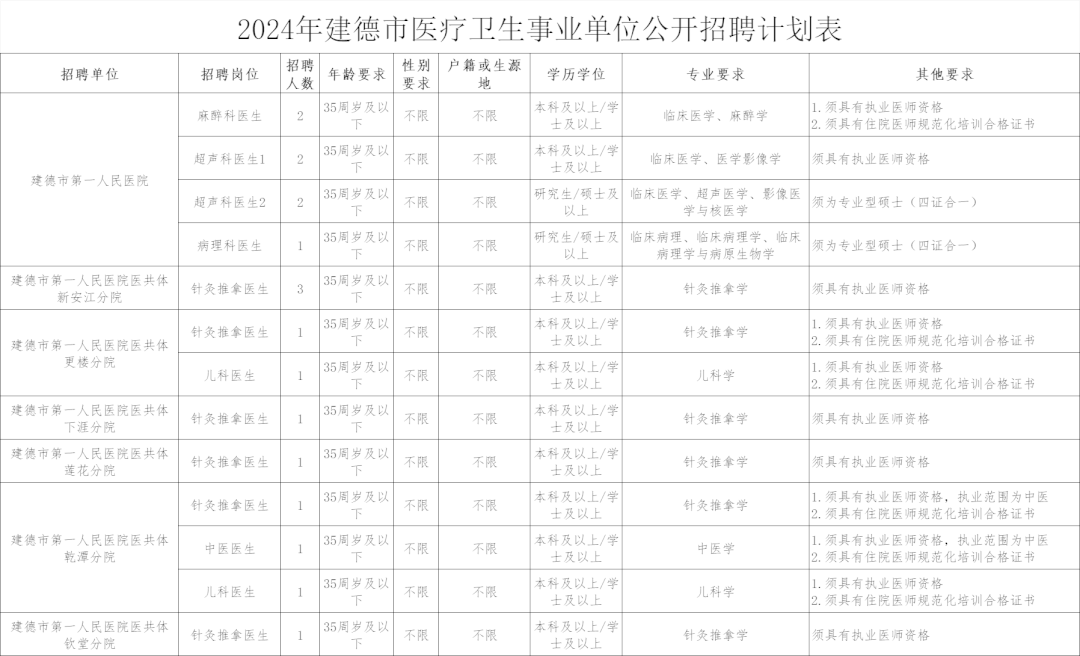 本次计划招聘事业编制工作人员18名,具体招聘单位、岗位、人数、条件及其他要求详见《2024年建德市医疗卫生事业单位公开招聘计划表》