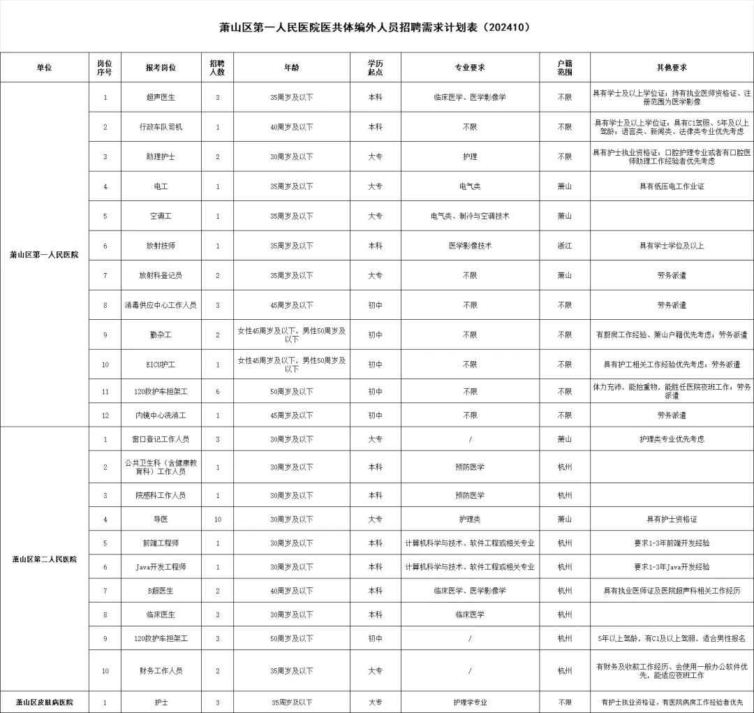 因工作需要,杭州市萧山区第一人民医院医共体面向社会招聘工作人员若干名,现将有关事项通知如下:本次招聘指标共54名。详见《萧山区第一人民医院医共体总院编外人员招聘需求计划表》(附件)。萧山区第一人民医院:助理护士、行政车队司机、电工、空调工、超声医生、放射技师岗位各项保险按政府规定执行,工资福利待遇按医院有关规定执行。放射科登记员、消毒供应中心工作人员、勤杂工、EICU护工、120救护车担架工、内镜中心洗消工岗位以第三方劳务派遣形式到医院相应岗位工作,录用后与第三方劳务公司签订劳动合同,日常管理由医院相关科室进行。萧山区第二人民医院:按照国家有关规定参加社会保险,工资参照医院有关规定执行,绩效工资参照医院同岗位员工待遇。萧山区皮肤病医院:按照国家有关规定参加社会保险,工资福利待遇按医院有关规定执行。坚持公开、公平、竞争、择优原则,按照现场报名、资格审核、面试、考察、体检、公示聘用等程序进行。萧山区第一人民医院:符合条件者请于2024年11月6日(上午8:00-11:30.下午13:15-17:00)至1号楼15楼组织人事科报名。联系方式:83807043、83807065.报名时需提供资料:报名时请随带近期1寸免冠彩照一张,身份证、户口本、学历证书、资格证书等原件及复印件各1份,报名行政车队司机需另外提供一份无重大交通违法证明。萧山区第二人民医院:符合条件者请于2024年11月6日上午8:00-11:00至杭州市萧山区瓜沥镇东灵路47号1号楼2楼组织人事科报名。联系方式:82577214.报名时需提供资料:报名时请随带近期1寸免冠彩照一张,身份证、户口本、学历证、学位证、任职资格证等原件及复印件各1份。萧山区皮肤病医院:符合条件者请于2024年11月6日,上午8:00-11:30.下午13:30-16:00至杭州市萧山区城厢街道乐园路58号三楼人事科。联系方式:82670991.报名时需提供资料:个人简历,身份证、户口本、学历证书、任职资格证等相关资料原件及复印件各1份。对报名人员进行资格审核,经资格审核通过后参加面试,实际报名人数超过1:9的,需开设笔试环节,根据笔试成绩从高分到低分按1:9确定入围面试的人员(笔试成绩不计入总成绩)。具体时间、地点另行通知。考察合格人员按规定时间(另行通知)到指定地点进行体检。体检费用自理。经考察、体检合格后,确定拟聘用对象,并在医院公告栏对拟录用人员进行为期5个工作日的公示。经公示无异议的,予以录用,按规定程序办理聘用手续,签订劳动合同。以下情况取消录用资格,招聘单位酌情按综合成绩从高到低原则,依次确定递补对象予以补录。1、聘用人员必须在规定时间内报到,逾期不报到或试用期内发现有不符合录用条件的;2、考察后不宜录用(放弃)的、体检不合格(放弃)的;萧山区第一人民医院医共体总院编外人员招聘需求计划表.xls点击【阅读原文】查看附件